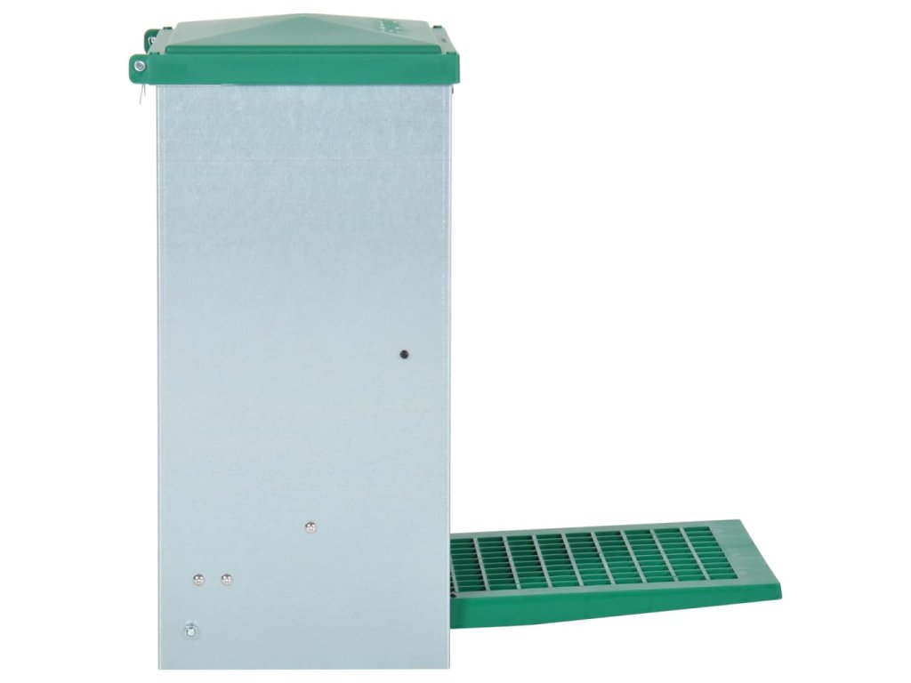Automatické krmítko je vyrobené z pozinkovaného plechu o tloušťce 1 mm, což je oproti ostatním krmítkům silnější, zajišťuje to tedy mimořádnou stabilitu. Mřížkový nášlap je zhotovený z plastu a nebudou se na něm hromadit exkrementy ani voda. Když zvířata stoupnou na nášlap, dávkovač otevře klapku pro přístup ke krmivu. Vzhledem k velkému objemu nádoby ušetříte čas, protože nebudete muset krmítko neustále doplňovat jako dříve.