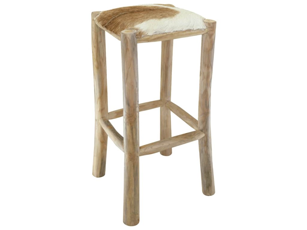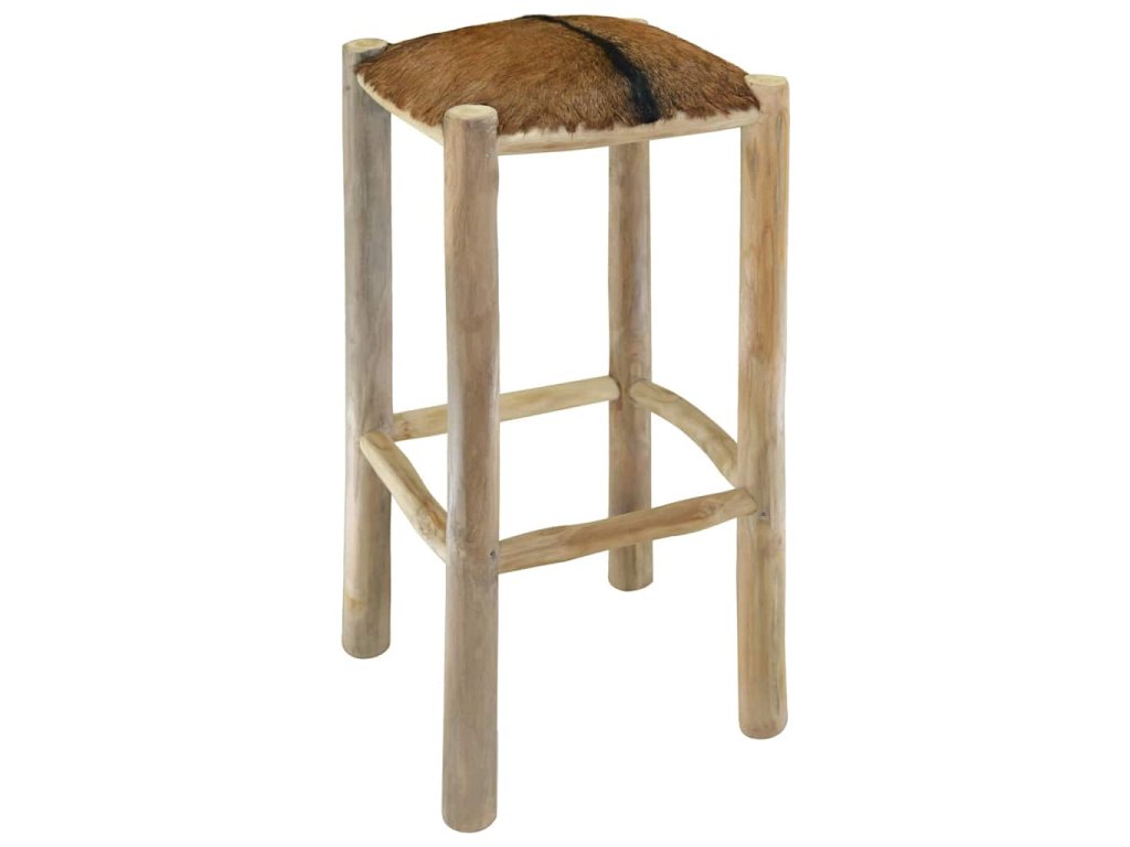 Naše barová stolička má pevný rám z teaku a je stabilní a odolná. Sedák je čalouněný pevnou, odolnou a poddajnou 100% pravou kozí kůží s kozím vzorem. Kůže s chlupem je měkká a příjemná na dotek. Krásný přirozený vzor kůže každé stoličky je unikátní a lehce odlišný od všech ostatních. Sedák má měkké polstrování, takže se na něm krásně sedí. Nohy ze dřeva v přírodní barvě jen podtrhují rustikální vzhled stoličky.
