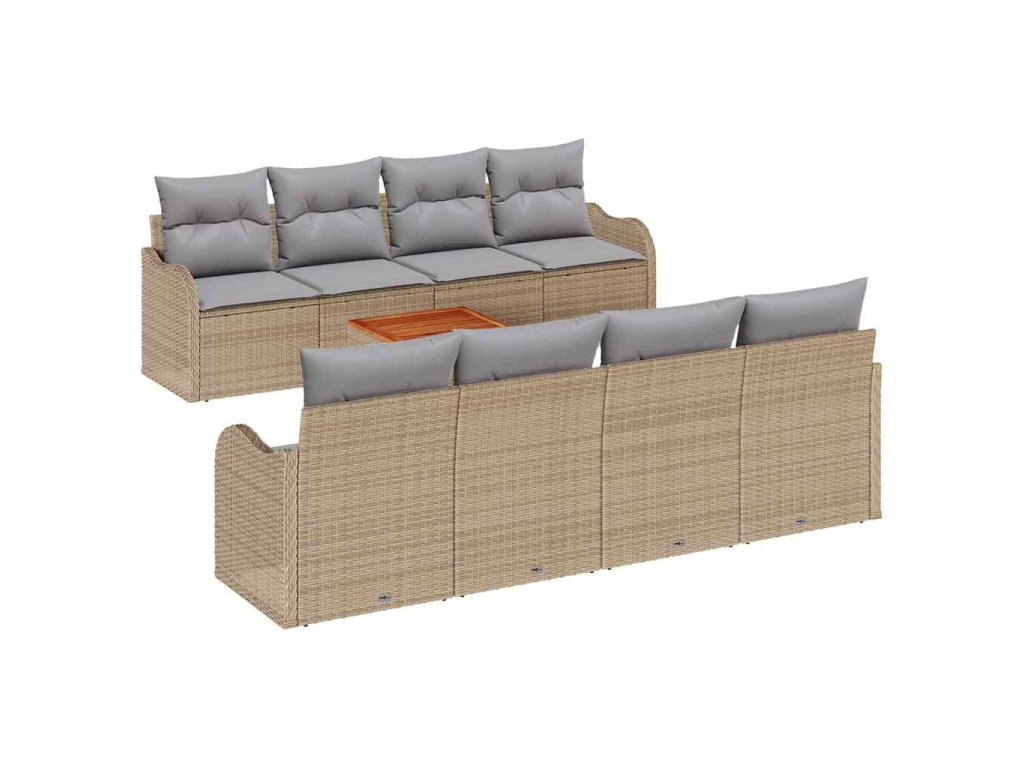 - Materiály: Tento sofa set je vyrobený z poly ratanu, je stylový a odolný. Textura je ideální na venek, odolává vlhkosti i opotřebení. Práškově lakovaná ocel je silná a spolehlivá. Povrchy z akáciového dřeva dodávají přírodní šmrnc.