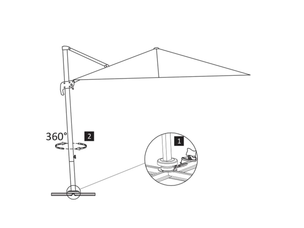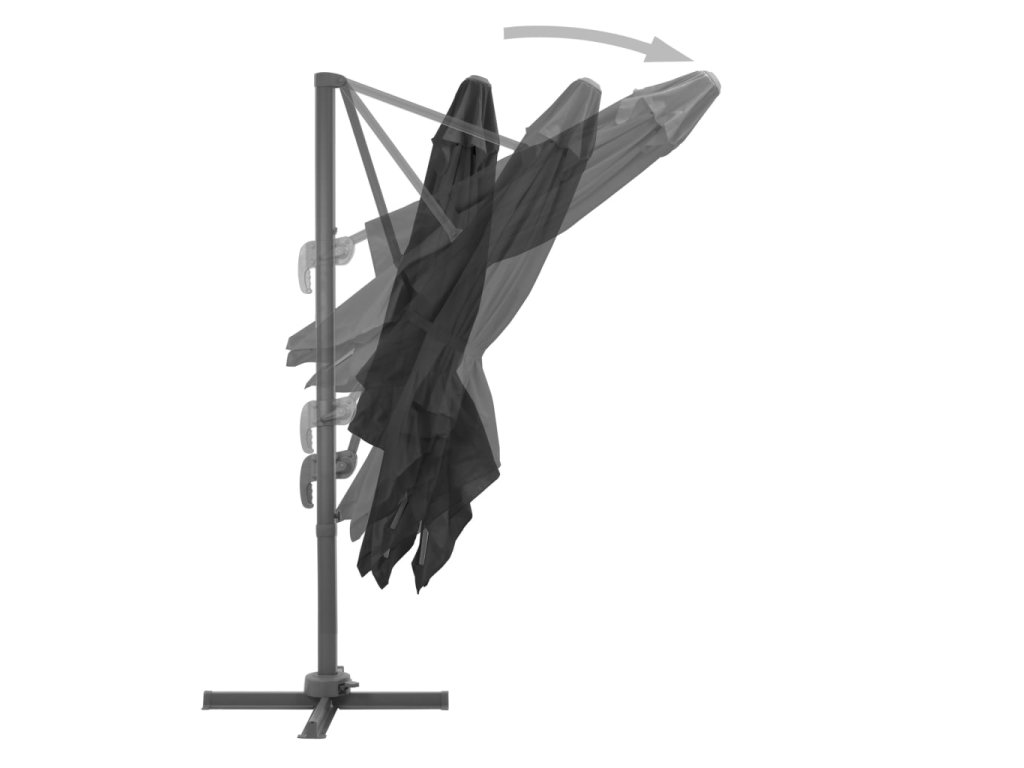 Stříška slunečníku je vyrobená z polyesteru, který nepropouští UV záření a nevybledne. Skvěle vás ochrání před sluncem a navíc se snadno čistí. Slunečník je opatřen křížovou základnou pro lepší stabilitu. Pro otevření a zavření stačí otočit páčkou na tyči. Zatlačením nahoru nebo dolů si pak můžete nastavit úhel stříšky. Středovou tyč lze pomocí pedálu otáčet o 360 stupňů. Je vyrobena ze silného hliníku s práškovým nástřikem a opatřena 8 odolnými žebry. Slunečník se díky ní nehýbe a dlouho vydrží. Sestavení výrobku je jednoduché.