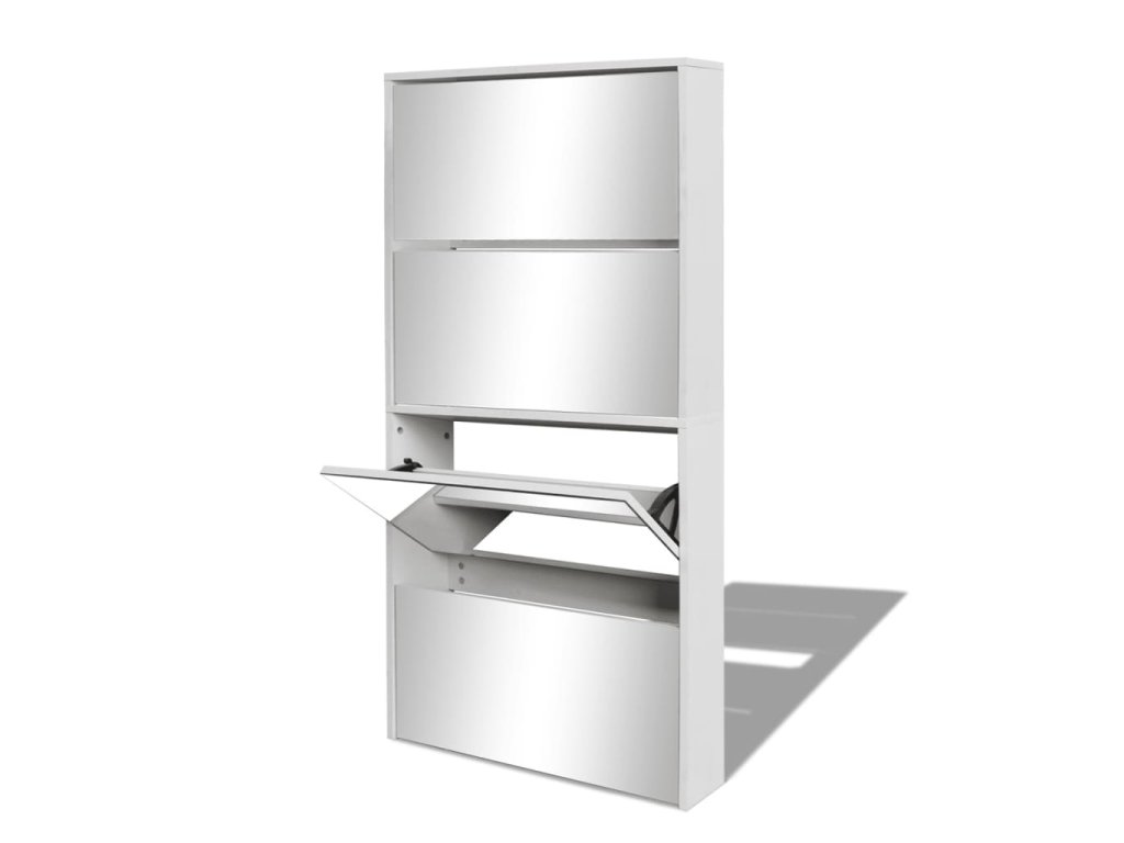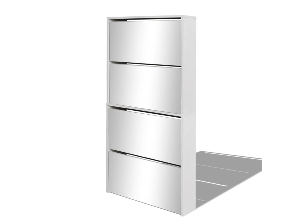 Tento zrcadlový botník má čtyři vyklápěcí přihrádky, z nichž každá pojme 3 až 4 páry obuvi. Botník se montuje přímo na stěnu. Tato pevná a odolná předsíňová skříňka je vyrobena z vysoce kvalitního materiálu a je velmi praktickým kusem nábytku, kde můžete úhledně a stylově ukládat své boty, aby nebyly poházené po bytě.