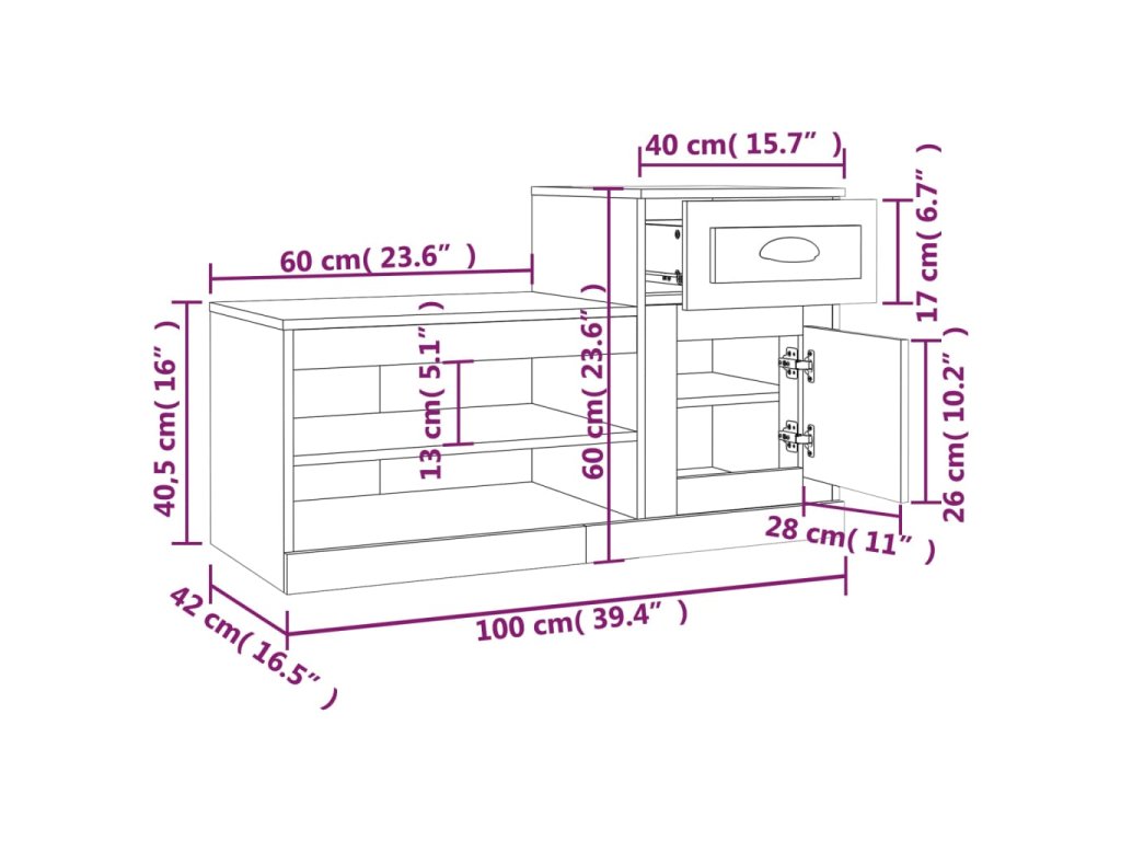 - Rozměry botníku (dolní): 60 x 42 x 40,5 cm (D x Š x V)