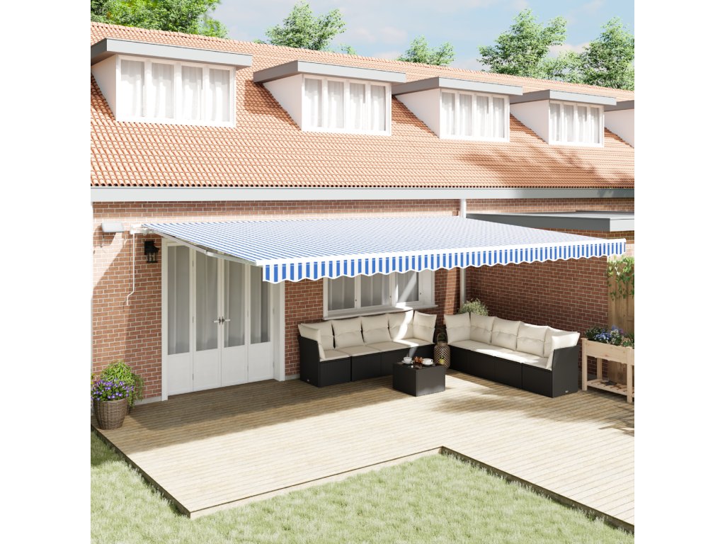 Tahle moderní zatahovací sluneční clona je navržena tak, aby vám zlepšila venkovní zážitky během slunečných dní. S čistými liniemi a minimálními zdobením vypadá stylově a funkčně, ideálně se hodí do moderních zahrad a na terasy. S hladkým pruhovaným designem v modré a bílé je to příjemný doplněk, který kombinuje eleganci a praktičnost. Tato markýza se hodí na letní akce, chrání váš prostor před silným UV zářením a zároveň dodává šarm vašemu venkovnímu prostředí.