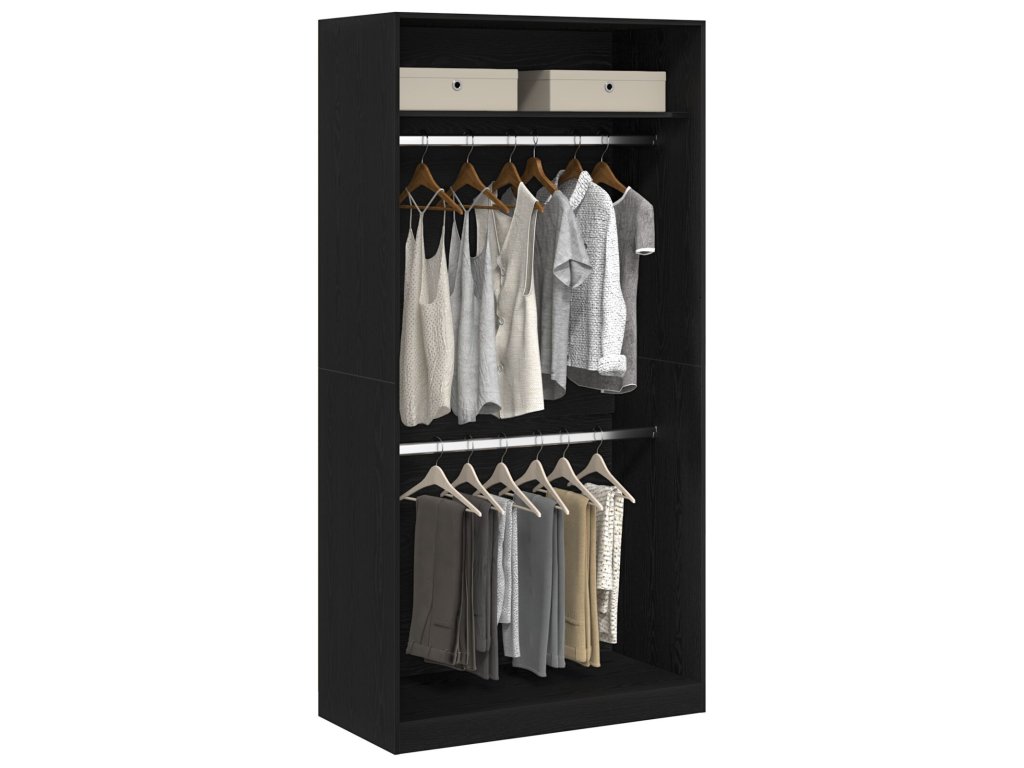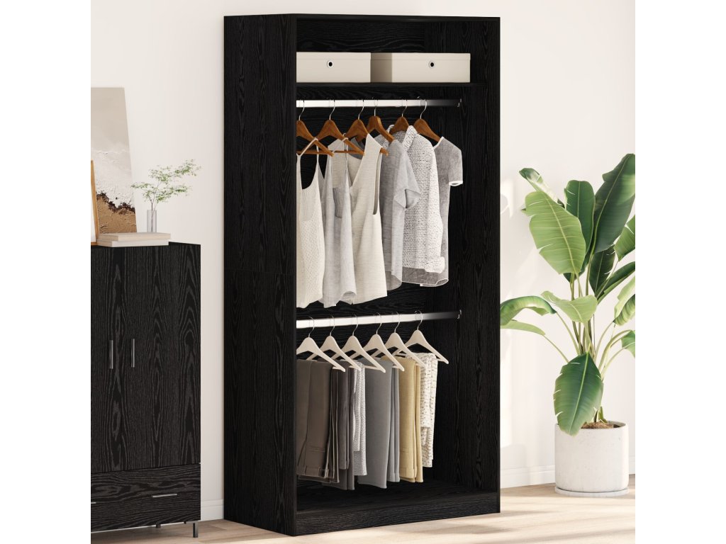 Stavba z inženýrského dřeva Toto je kvalitní inženýrské dřevo, které zajišťuje dlouhou životnost a odolnost vůči opotřebení. Elegantní vzhled materiálu skvěle doplní moderní interiéry a spojí sofistikovanost s praktičností. Prostorná kapacita úložného prostoru Šatník má velký hlavní oddíl, ideální pro organizaci oblečení a další nezbytnosti. Udržuje ložnici v pořádku, přičemž vše je snadno dostupné. Volně stojící design Díky flexibilní konstrukci můžete šatník umístit kamkoli bez zdi, takže se snadno přizpůsobí různým uspořádáním pokojů. Moderní estetika S minimalistickým designem se šatník hodí do moderních ložnic a jeho elegance se skvěle doplňuje s ostatním nábytkem. Dodává zjednodušený, ale luxusní vzhled. Bezproblémová montáž Sestavení zvládnou dva lidé se šroubovákem a obsahuje všechny potřebné komponenty. Je to pohodlné a praktické řešení pro váš domov.- Barva: Černý dub