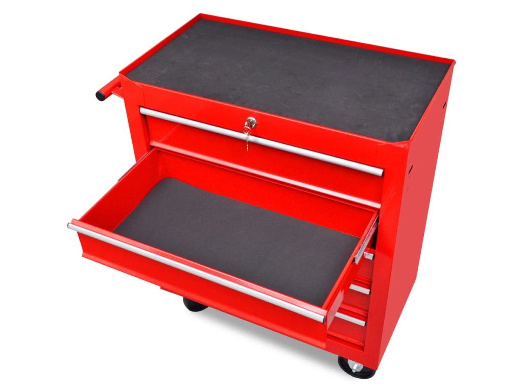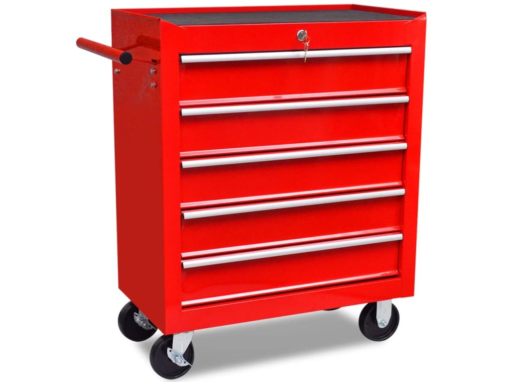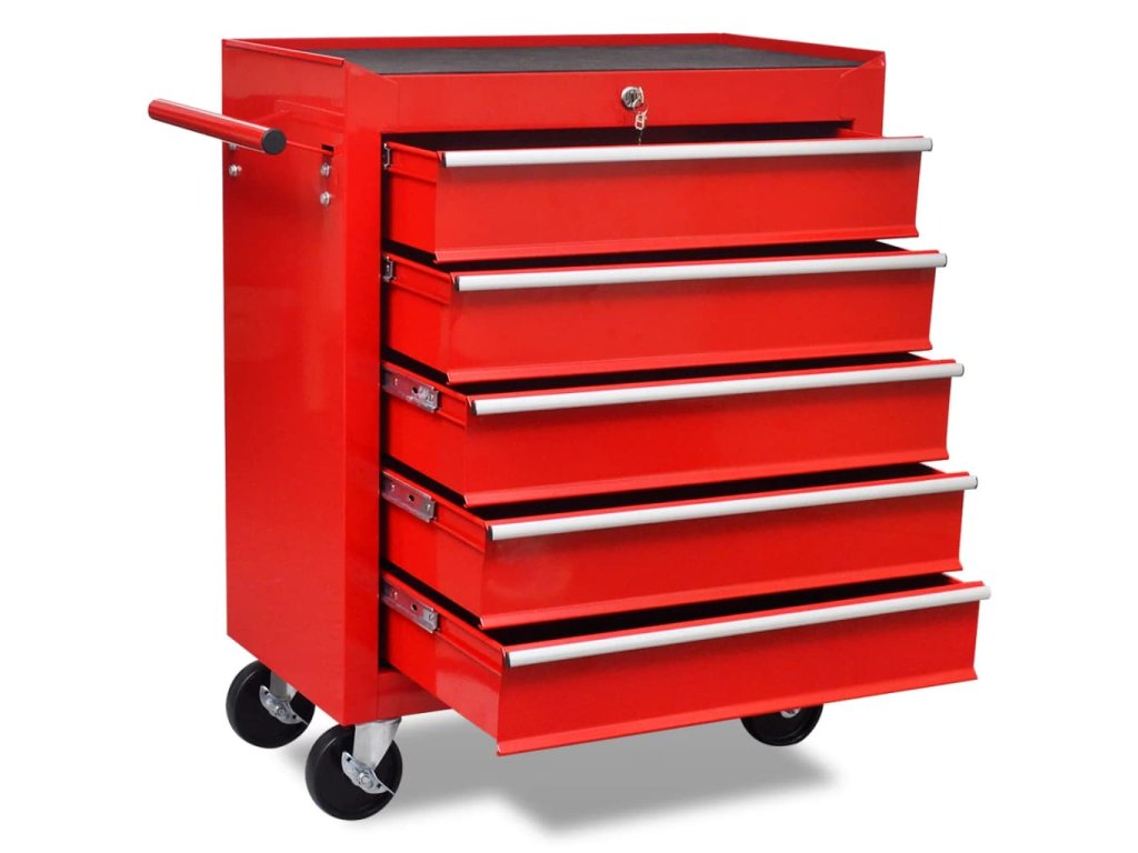 Využijte tento šikovný vozík do dílny s pěti vysouvacími šuplíky ke skladování a uspořádání vašeho nářadí. Každá zásuvka je opatřena protiskluzovou výstelkou na dně, aby udržela nářadí na místě.