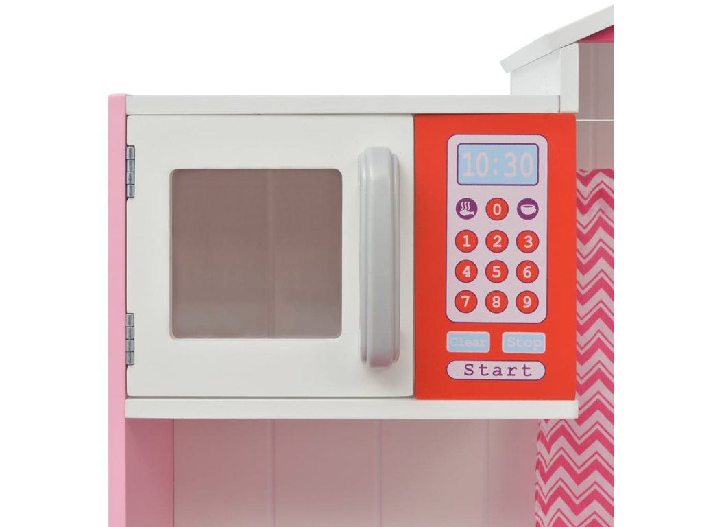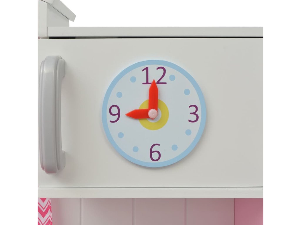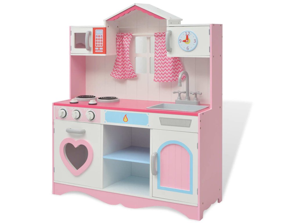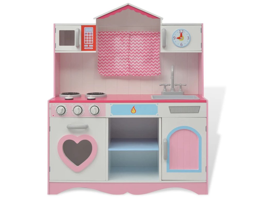 Tato rozkošná, snadno sestavitelná kuchyňka na hraní je vyrobena z MDF a borového dřeva a má krásný design. Díky oknům se záclonami, živým barvám a tradičnímu vzhledu vypadá tato kuchyňka jako opravdová. Má kohoutek s dřezem a troubu s knoflíky, které vydávají zvuk kliknutí, což činí zážitek z vaření mnohem živějším. Sporák má 2 otočné knoflíky, které umožňují vašemu malému šéfkuchaři nastavit teplotu. Dvě prostorné skříňky a dvoupatrový regál poskytují dostatek úložného prostoru. Hodiny s pohyblivými ručičkami zdobí dvířka horní skříňky a trouba s 2 odděleními a horní mikrovlnná trouba doplňují kuchyňské spotřebiče.