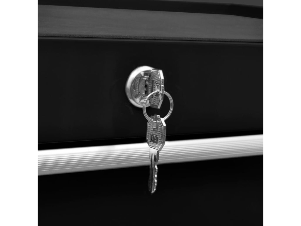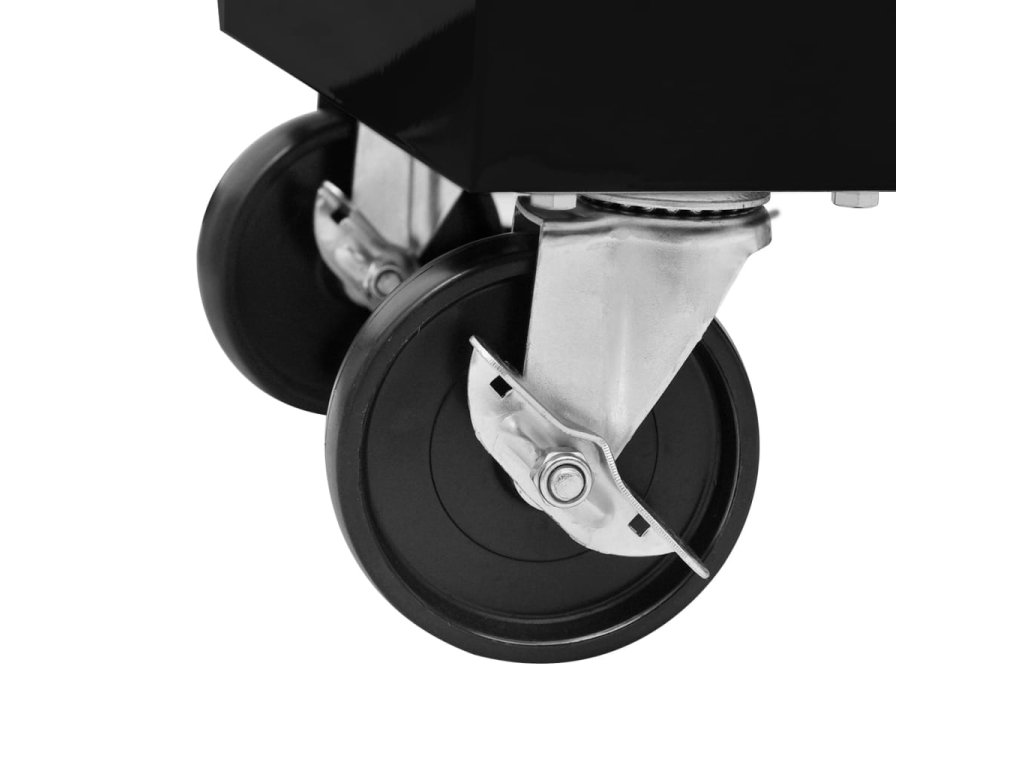 Všechny zásuvky jsou vybavené integrovaným zámkem, který umožňuje najednou je všechny zamknout, a tím předejít náhodnému otevření při pohybu vozíku. Dvě z pojezdových koleček mají brzdy. Robustní deska na nástrojovém vozíku je skvělá pro odkládání často používaných nástrojů na dosah ruky. K dispozici je také pohodlná boční rukojeť pro tlačení vozíku.