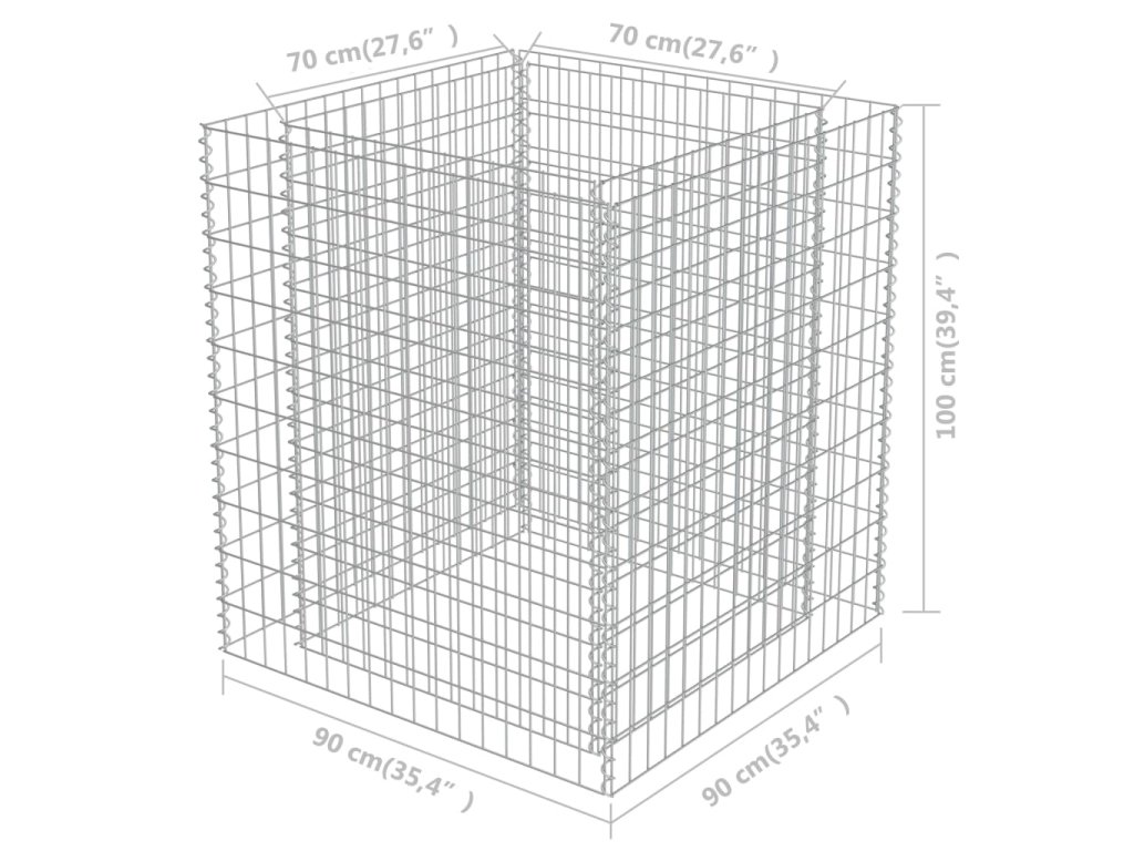 Robustní gabion je určen k tomu, aby byl naplněn kameny nebo štěrkem. Je vyrobený z nerezavějící pozinkované oceli, která nepodléhá povětrnostním vlivům, takže vysoký záhon je velmi stabilní a odolný. Síťová mřížka je tvořená svislými a vodorovnými dráty, které jsou ve všech spojích svařené, aby se tak zajistila mimořádná pevnost.