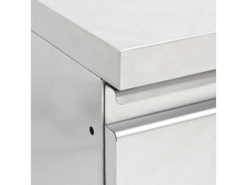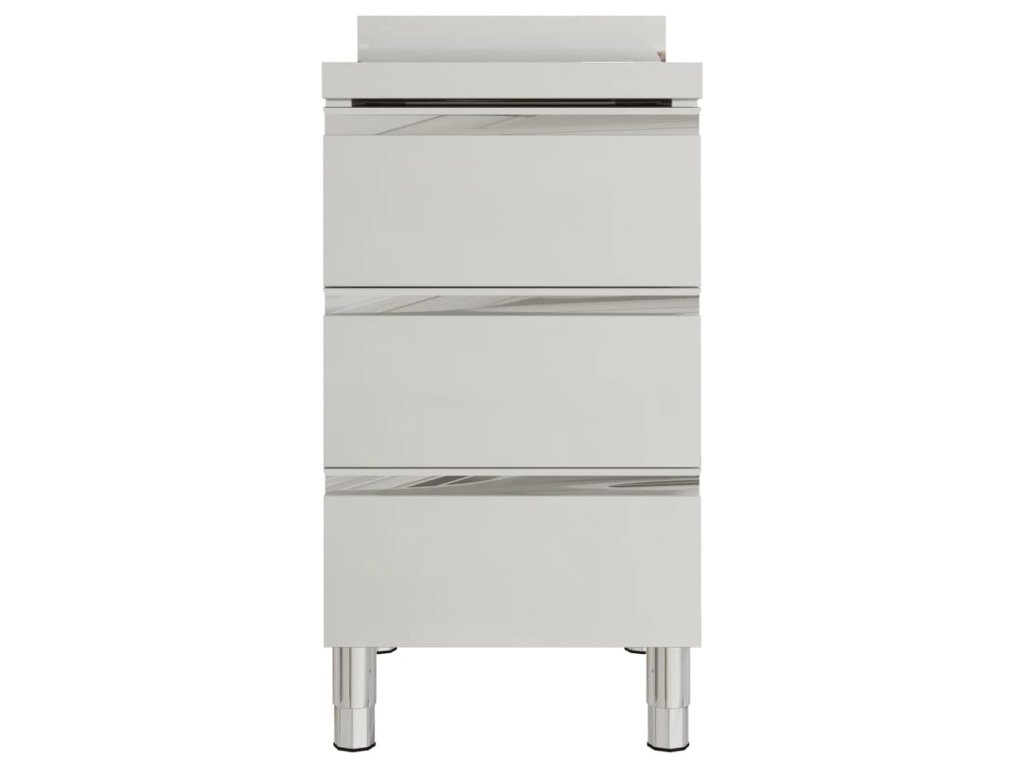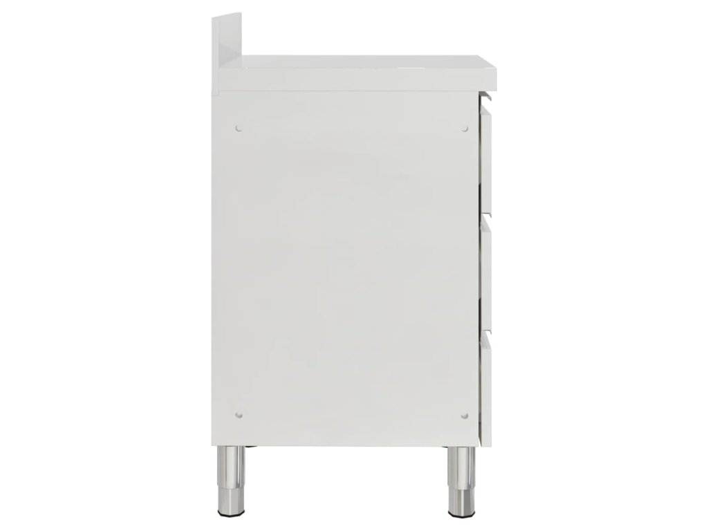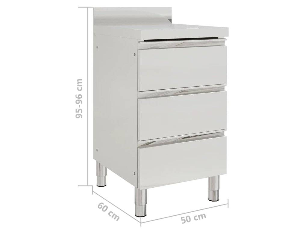 Tato skříňka je vyrobená z kvalitní nerezové oceli a je robustní, antikorozní a snadno se čistí. Tři zásuvky poskytují dostatek úložného prostoru pro úklidové vybavení a příslušenství. Nastavitelné nožičky umožňují vyrovnat skříňku i na nerovné ploše. Součástí skříňky je 10 cm vysoký zadní lem a otvor na vodní trubku.