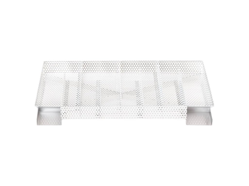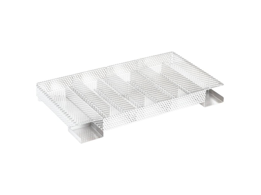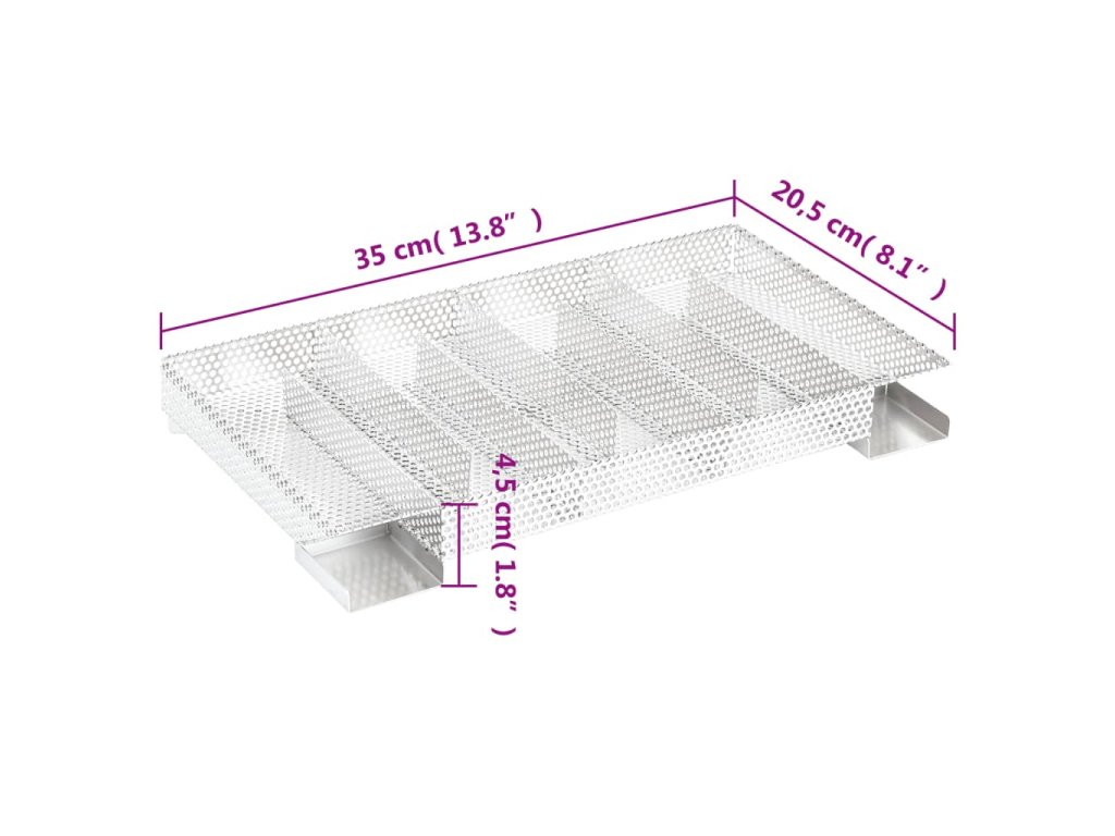 - Pevná mřížková konstrukce: Kompaktní mřížka obdélníkového tvaru umožňuje rovnoměrné a pomalé hoření třísek až po dobu 20 hodin. Délka trvání závisí především na druhu dřeva určeného k uzení. Pro dosažení nejlepších výsledků se doporučuje používat štěpky o velikosti zrn 0,5–2,0 mm.