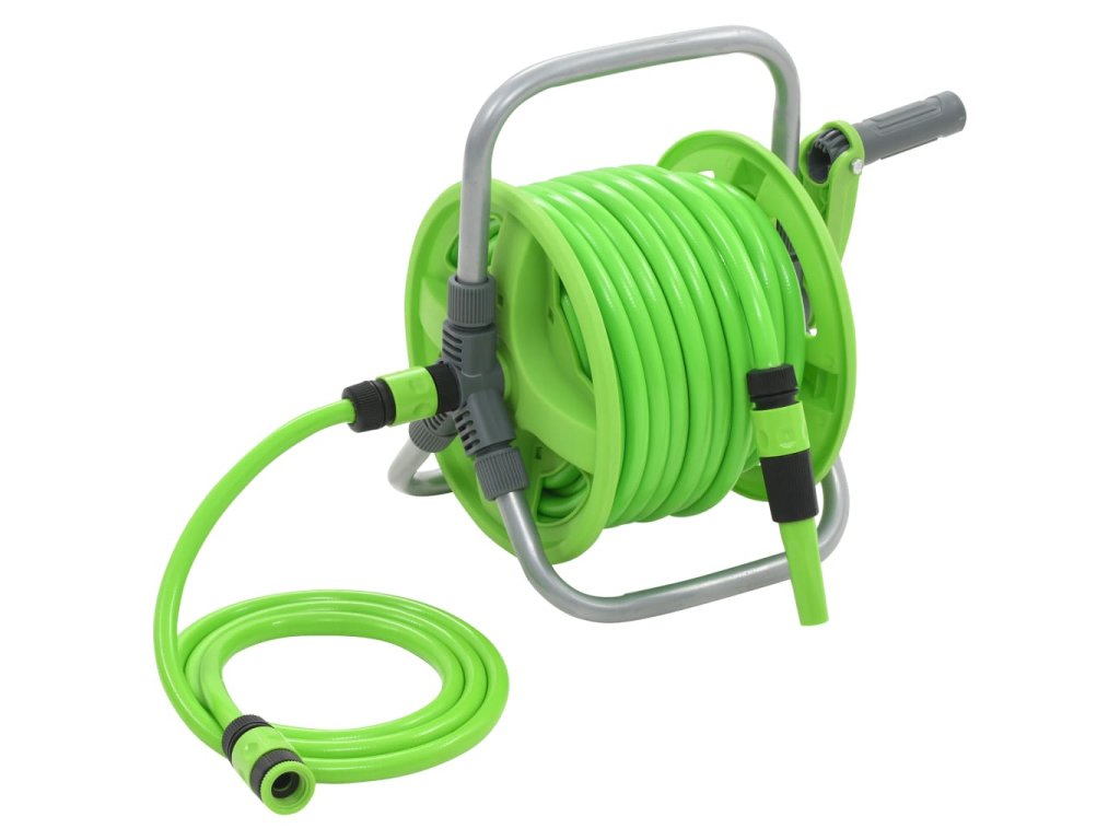 Hadicový naviják dodáváme s již navinutou 20metrovou zahradní hadicí. Jeho součástí je také 2metrová hadicová přípojka. Proud vody snadno upravíte pootočením rozprašovače, jenž je součástí balení. Hadice je vyrobena z vysoce kvalitního PVC, které je velmi odolné. Praktická rukojeť usnadňuje zvedání či přenášení hadicového navijáku.