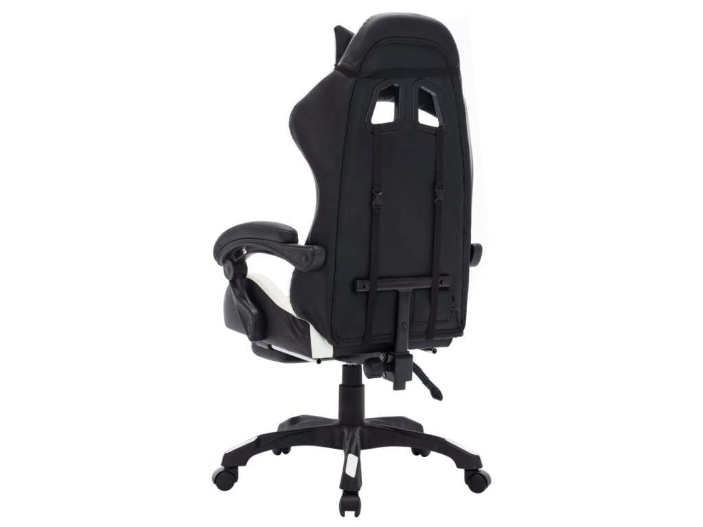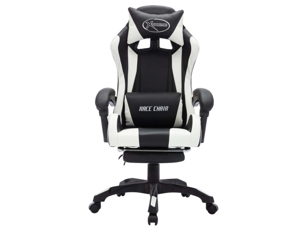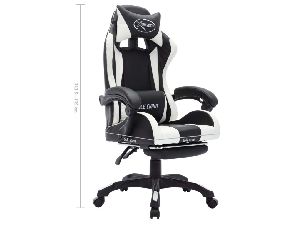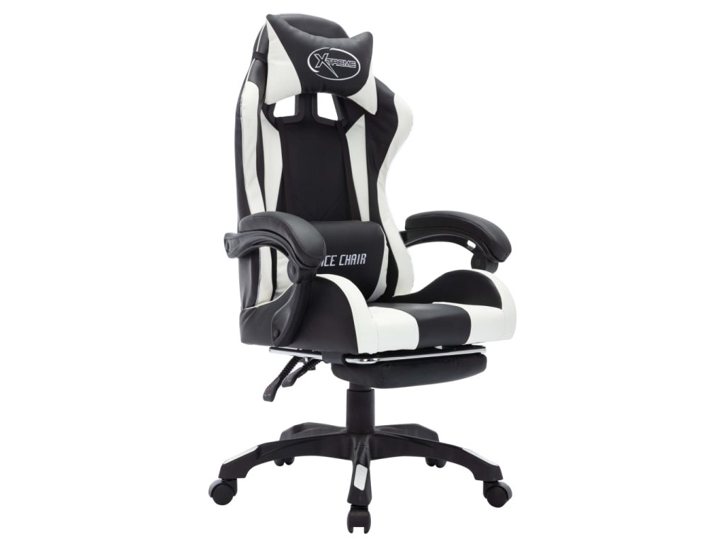 Tato herní židle je čalouněná umělou kůží, která se snadno čistí. Má sklopnou opěrku nohou, kterou lze sklopit pod sedák, kdykoli ji nepoužíváte. Součástí židle je také hustě polstrovaná opěrka hlavy a polštářek pod bedra, která vám nabídnou extra pohodlí pro každý náročný pracovní den. Kancelářská židle je vybavená plynovým zvedacím mechanismem, takže je výškově nastavitelná. Úhel sklopení je také nastavitelný, takže pokud máte pocit, že byste si chtěli zdřímnout, umístěte opěradlo do zcela sklopené polohy. Podvozek s pojezdovými kolečky s 360° otáčením usnadňuje pohyb po okolí. Okraj opěradel je vybaven LED světly poskytující lepší herní atmosféru. Pomocí dálkového ovladače můžete snadno měnit barvu a způsob blikání světel.