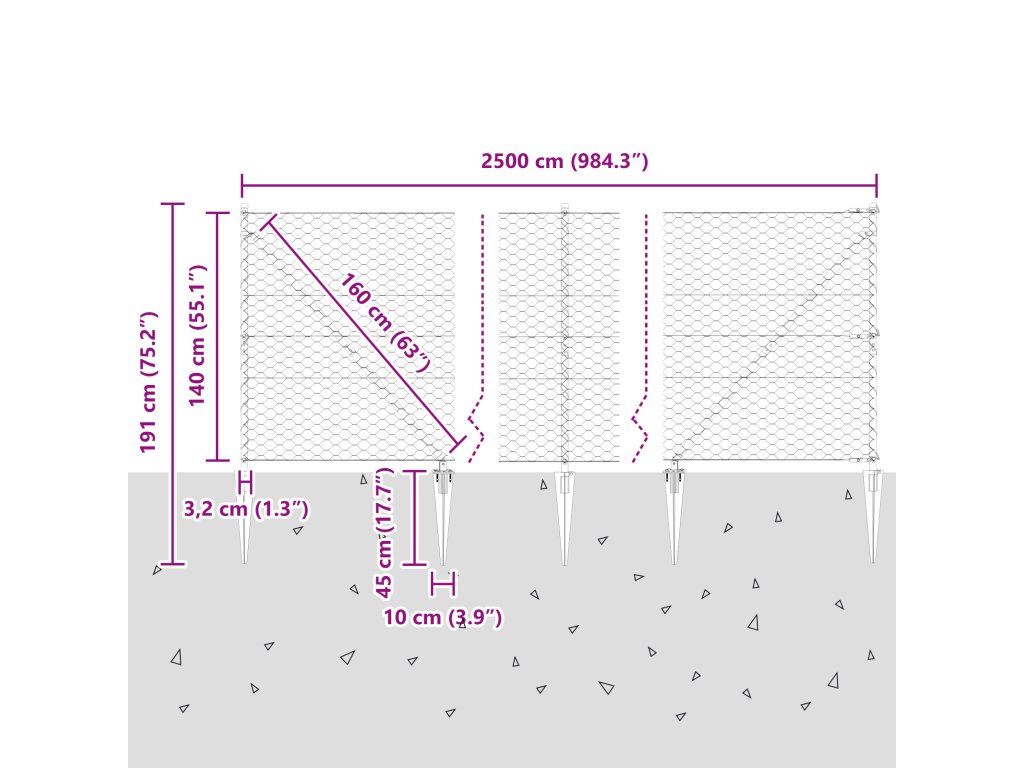 - Celkové rozměry: 2500 x 3.2 x 140 cm (D x Š x V)