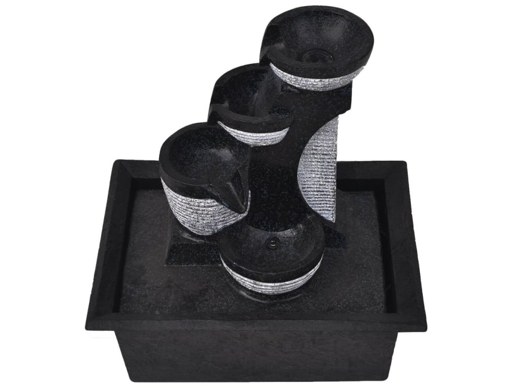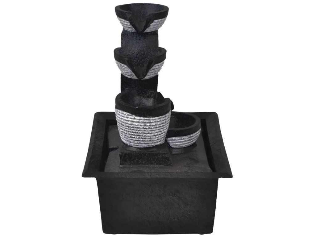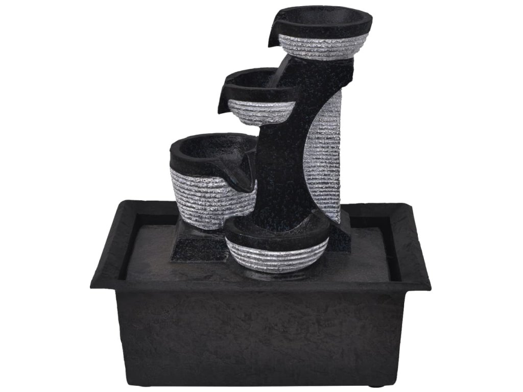 Tento prvek s tekoucí vodou se bude hodit do každého stylu zařízení. Má čtyřúrovňovou vodní kaskádu a je osvětlen LED diodami, což vytváří úchvatný vizuální efekt, obzvláště v noci. Tato fontána je vyrobena z polyresinu (syntetická pryskyřice) a je odolná vůči UV záření, což znamená, že bude vypadat stále dobře a uchovávat si svou barvu, i když ji umístíte na přímé sluneční světlo. Několik pramínků a uklidňující zvuk tekoucí vody navozuje relaxační a meditativní atmosféru. Přiložené vysoce kvalitní čerpadlo zajišťuje bezpečné a spolehlivé používání.