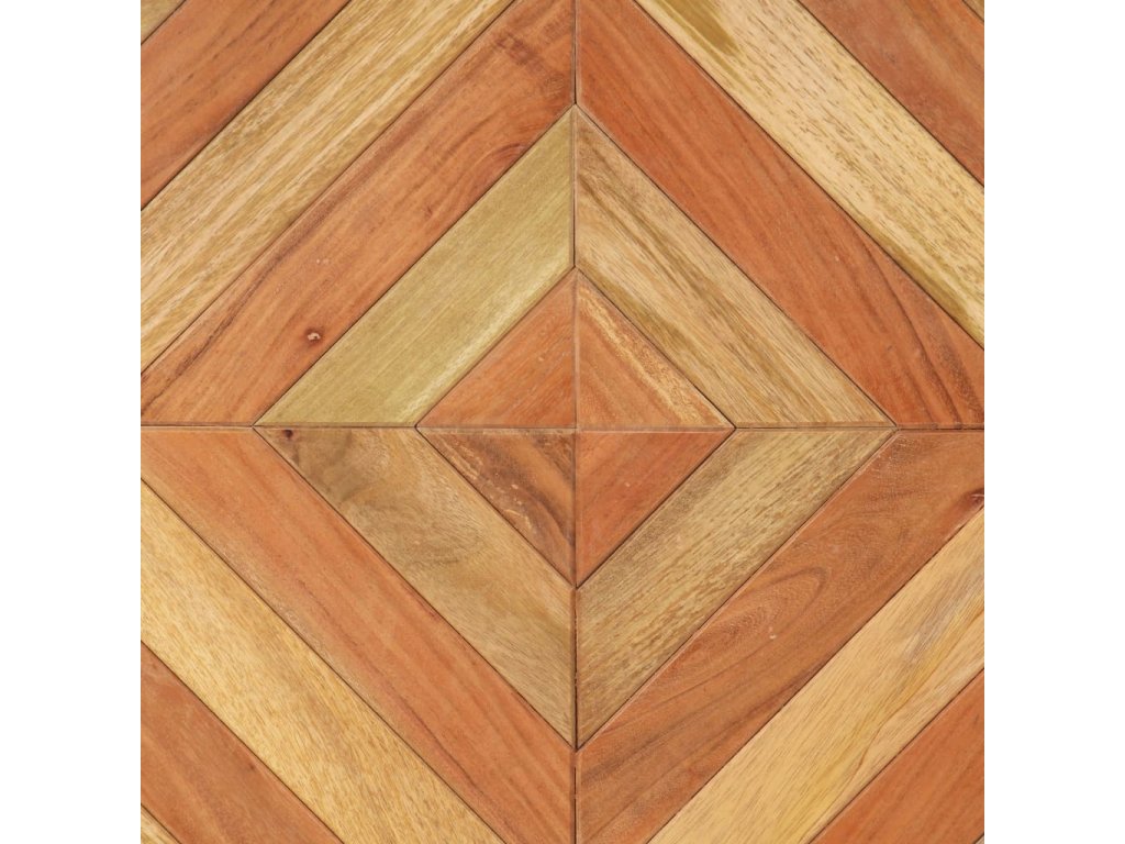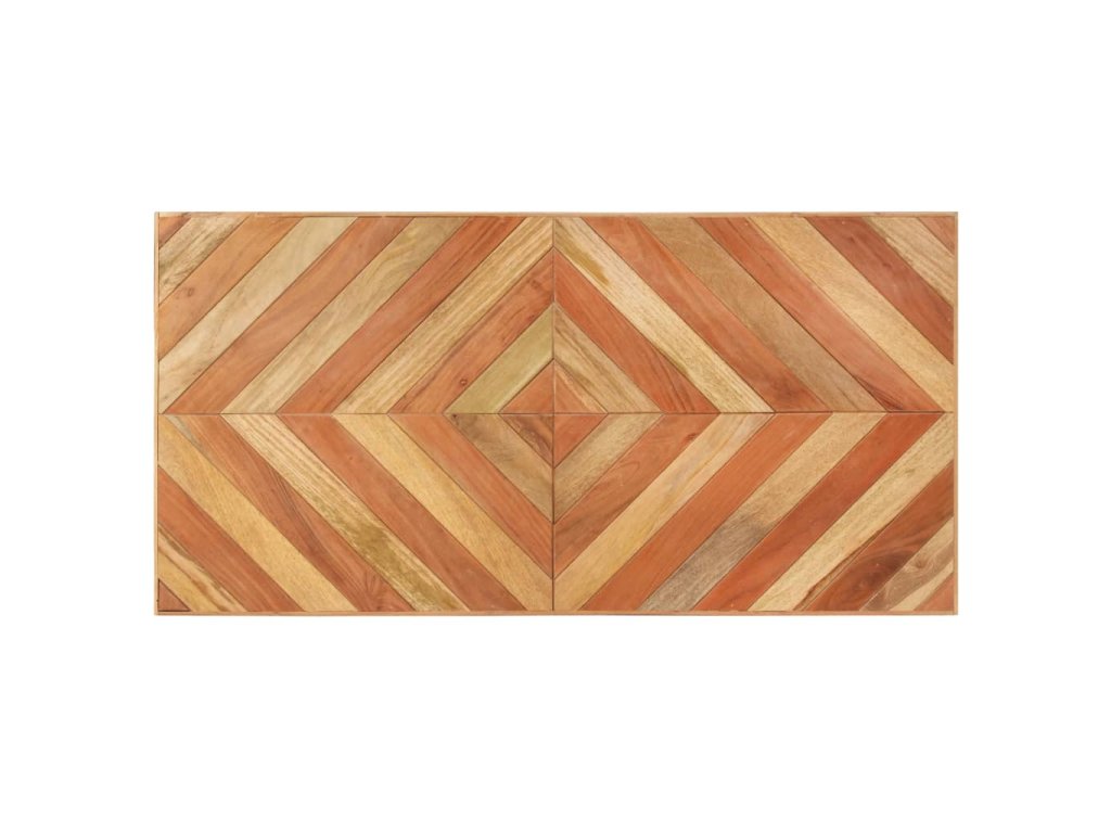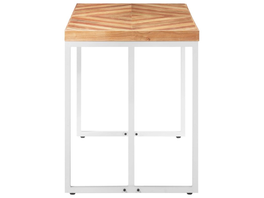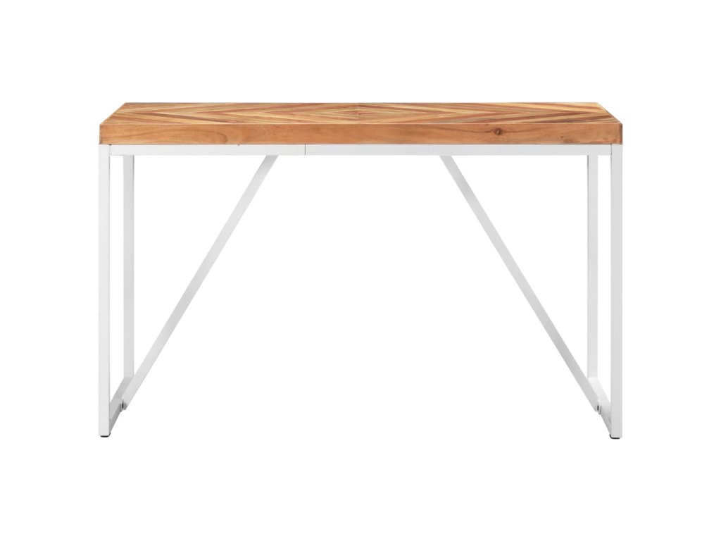 Jídelní stůl je ručně vyrobený z masivního akáciového a mangovníkového dřeva, je velmi stabilní a odolný. Bílé, práškově lakované ocelové nohy poskytují extra stabilitu. Robustní deska stolu má chevron a mozaikový design, který je velmi působivým doplňkem do vašeho interiéru. Je také perfektní pro servírování nápojů nebo občerstvení.