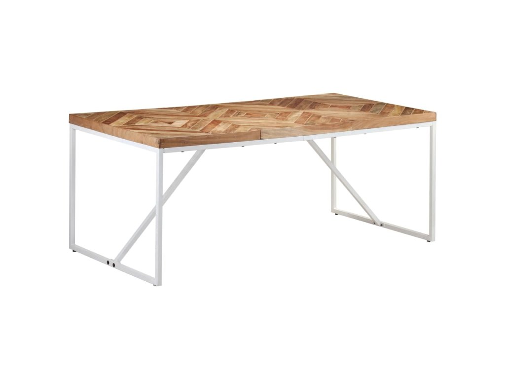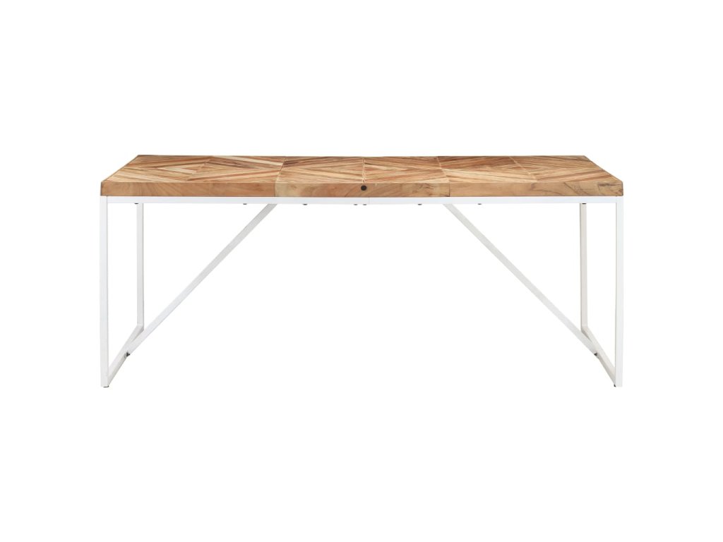 Jídelní stůl je ručně vyrobený z masivního akáciového a mangovníkového dřeva, je velmi stabilní a odolný. Bílé, práškově lakované ocelové nohy poskytují extra stabilitu. Robustní deska stolu má chevron a mozaikový design, který je velmi působivým doplňkem do vašeho interiéru. Je také perfektní pro servírování nápojů nebo občerstvení.