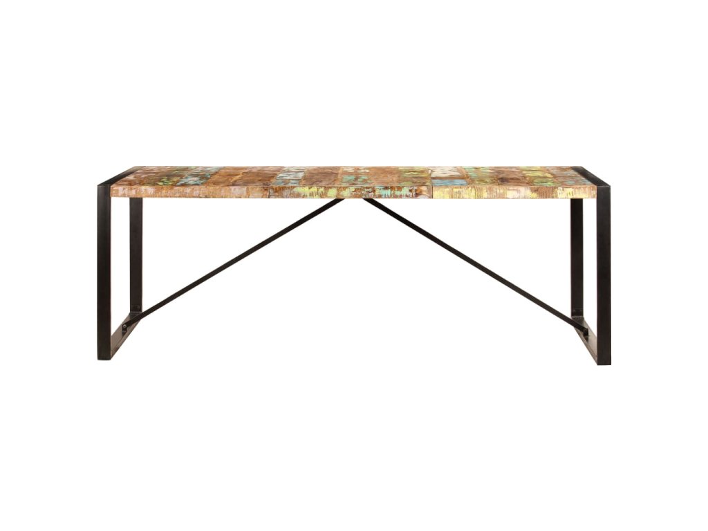 Jídelní stůl je vyrobený z masivního recyklovaného dřeva, které pochází z trámů, podlah a podpěrných nosníků ze starých budov určených k demolici. Může tedy sestávat z celé řady různých druhů dřeva, jako jsou borovice, teak, buk, dub, cedr, mangovník, akácie apod. Recyklované dřevo tak nabývá vlastností všech těchto rozličných typů dřevin. Navíc je již zestárlé, ošlehané a vyschlé, takže se nesmršťuje ani neohýbá. Stůl je ručně vyrobený a překrásná kresba dřeva ho činí naprosto jedinečným a lehce odlišným od všech ostatních. Silné nohy z práškovaného železa dodávají stolu na odolnosti. Sestavení výrobku je snadné.