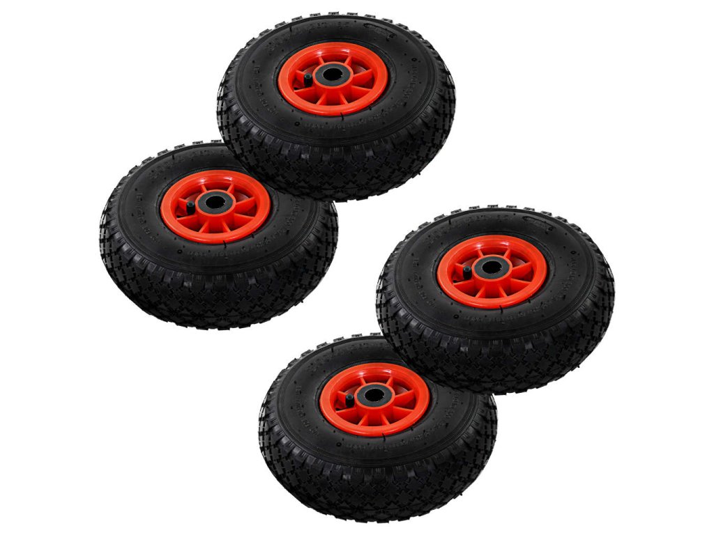 Solidní pneumatiky jsou vyrobeny z odolného, otěruvzdorného pryžového materiálu a mají speciálně designovaný vzorek, který zvyšuje přilnavost k povrchu při vyšších rychlostech. Ráfky kol jsou vyrobeny z robustního plastu. Náhradní kolečka k vozíku mají univerzální velikost a lze je snadno instalovat do rudlů, ručních vozíků apod.