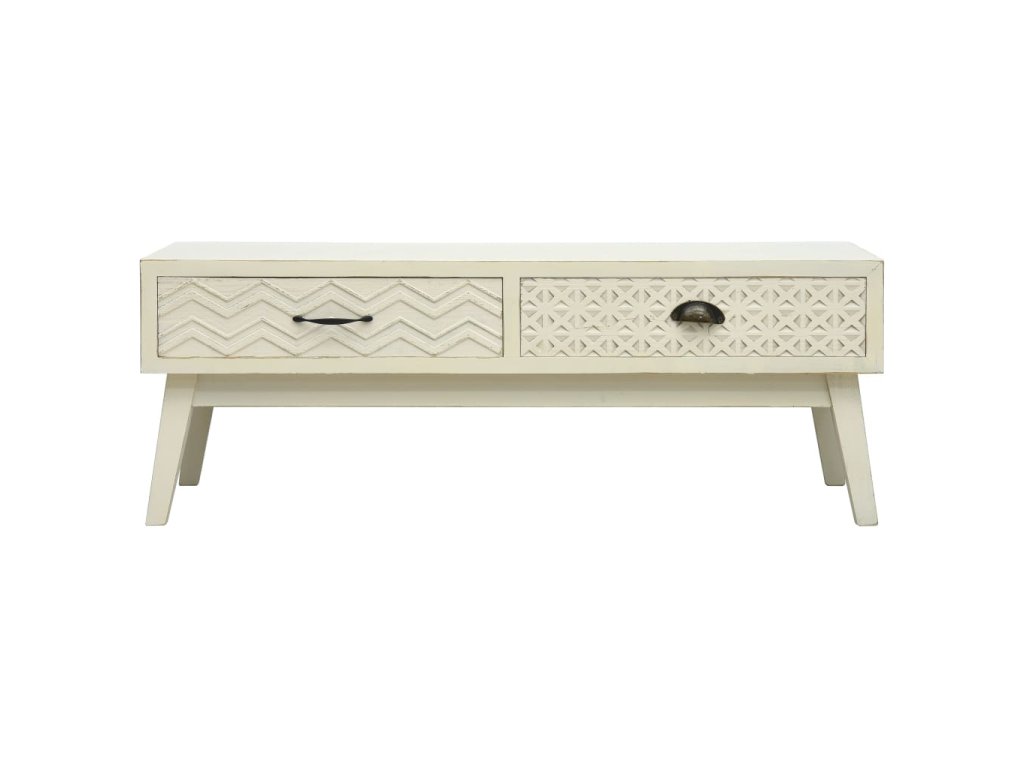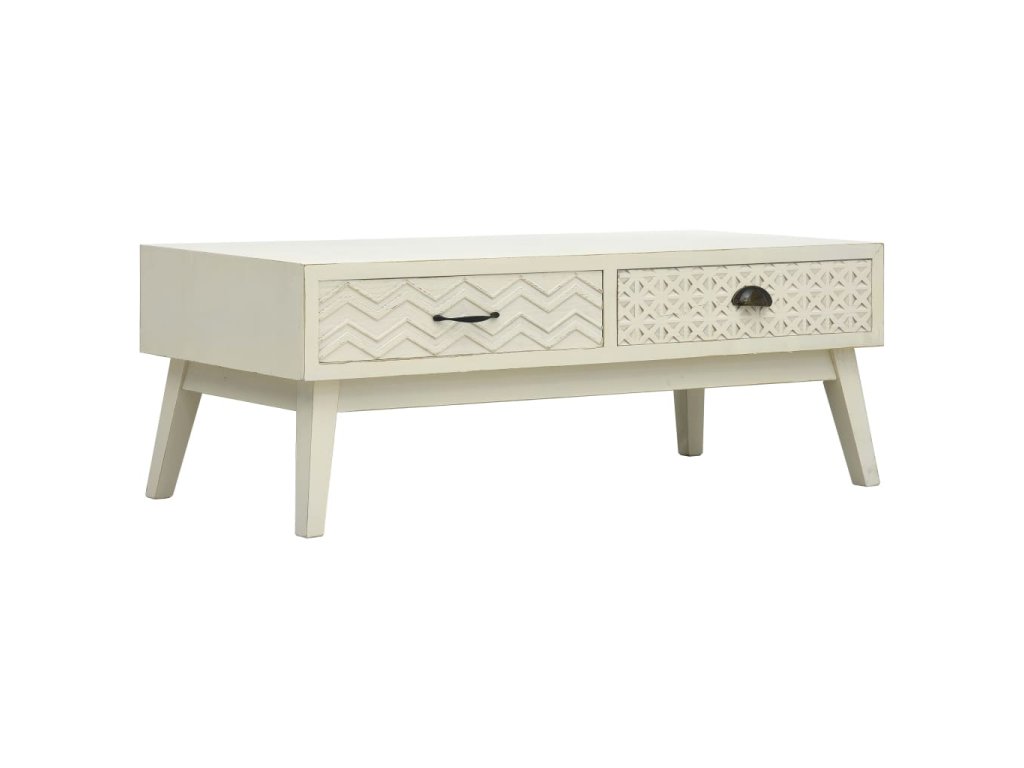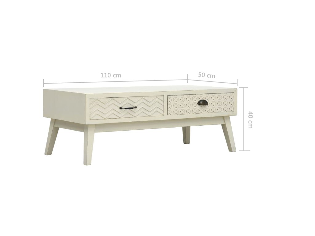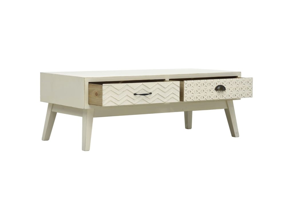 Tento nízký stolek je zhotovený z MDF a borového dřeva, je pevný a dlouhodobě odolný vůči opotřebení. Dvě zásuvky s vyřezávaným designem nabízí spoustu místa pro vaše knihy, dálkové ovladače a všechny maličkosti osobní potřeby, které často nevíte, kam uložit. Snadno se čistí a udržuje.