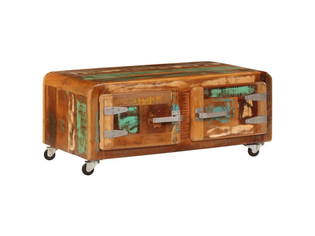 Stolek k pohovce je vyrobený z masivního recyklovaného dřeva, které pochází z trámů, podlah a podpěrných nosníků ze starých budov určených k demolici. Sestává tedy z různých druhů dřeva, jako jsou borovice, teak, buk, dub, cedr, mangovník, akácie apod. Recyklované dřevo tak nabývá vlastností všech těchto rozličných typů dřevin. Navíc je již zestárlé, ošlehané a vyschlé, takže se nesmršťuje ani neohýbá. Odkládací stolek je celý ručně vyrobený a elegantní kresba dřeva ho činí naprosto jedinečným a lehce odlišným od ostatních. Kovové prvky dodávají stolku industriální nádech. Stolek disponuje 2 skříňkami s dvířky, jež vám poskytnou spoustu prostoru k uložení vašich multimediálních zařízení, knížek a dalších věcí. Je rovněž vybavený 4 kolečky, takže se snadno přesouvá.