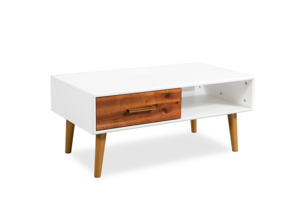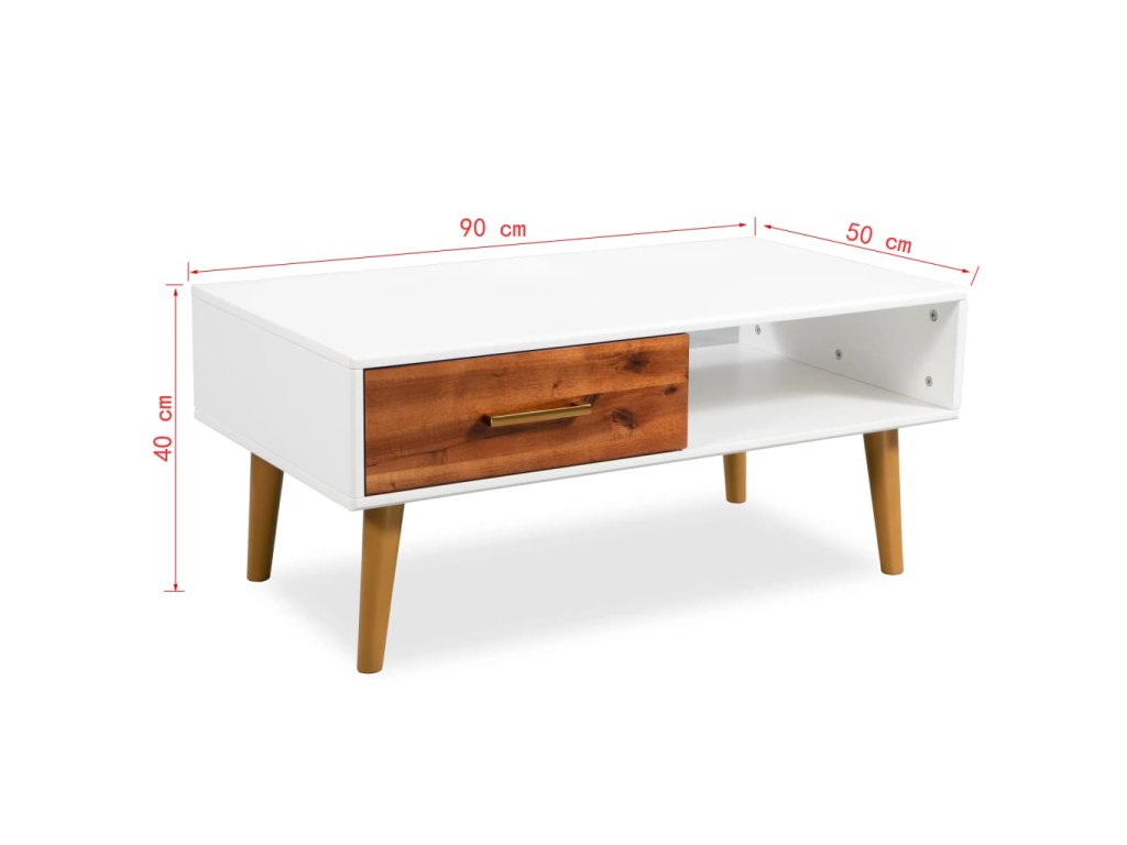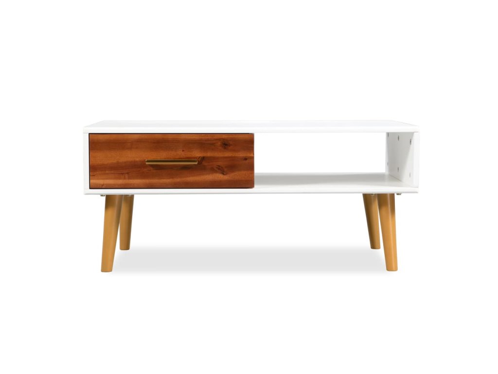 Konstrukce konferenčního stolku z masivního akáciového dřeva je velmi robustní a odolná, stejně jako stolní deska, která je zhotovená z vysoce kvalitního MDF. Stolek má zásuvku a velkou polici, kam si můžete přehledně uspořádat vaše multimediální zařízení, knihy, časopisy a další drobnosti, které chcete mít po ruce. Zásuvka s mosaznou úchytkou umocňuje celkový retro vzhled stolku a na jeho desce se budou krásně vyjímat dekorativní předměty, zarámované fotografie anebo hrnkové rostliny. Montáž je snadná.