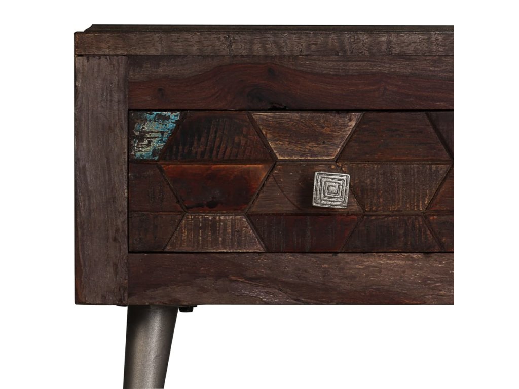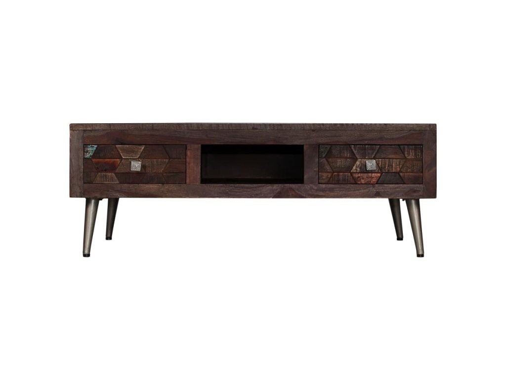 Stolek je zhotovený z masivního recyklovaného dřeva, které pochází z trámů, podlah a podpěrných nosníků ze starých budov určených k demolici. Může tedy obsahovat celou řadu různých typů dřeva, jako je borovice, teak, buk, dub, cedr, mangovník, akácie apod. Recyklované dřevo tak nabývá vlastností všech těchto rozličných druhů dřeva. Recyklované dřevo je již zestárlé, ošlehané a vyschlé, takže se nesmršťuje ani neohýbá. Překrásná kresba dřeva činí každý kus nábytku jedinečným a lehce odlišným od ostatních. Známky opotřebení a zřetelná textura dřeva vypovídají o jeho bohaté historii a dodávají stolku hřejivý a autentický vzhled. Každá fáze výrobního procesu je prováděna s největší pečlivostí, ať už se jedná o leštění, natírání anebo lakování. Tento stolek má pevnou horní desku, na kterou můžete pokládat dekorativní předměty, jako jsou košíky s ovocem nebo vázy. Disponuje spoustou úložného prostoru, kde si můžete přehledně ukládat své časopisy, knihy, DVD a multimediální zařízení tak, abyste je měli po ruce. Ocelové nohy dodávají stolku na robustnosti a podtrhují jeho industriální styl. Montáž je snadná.
