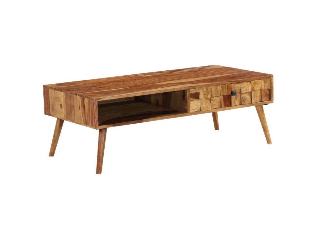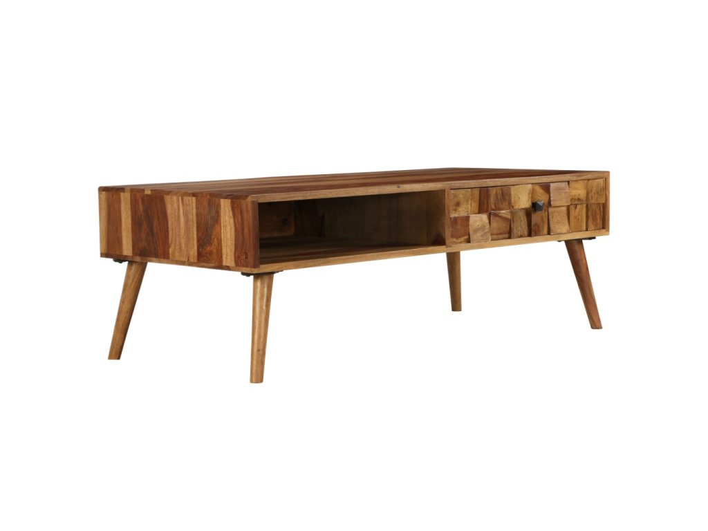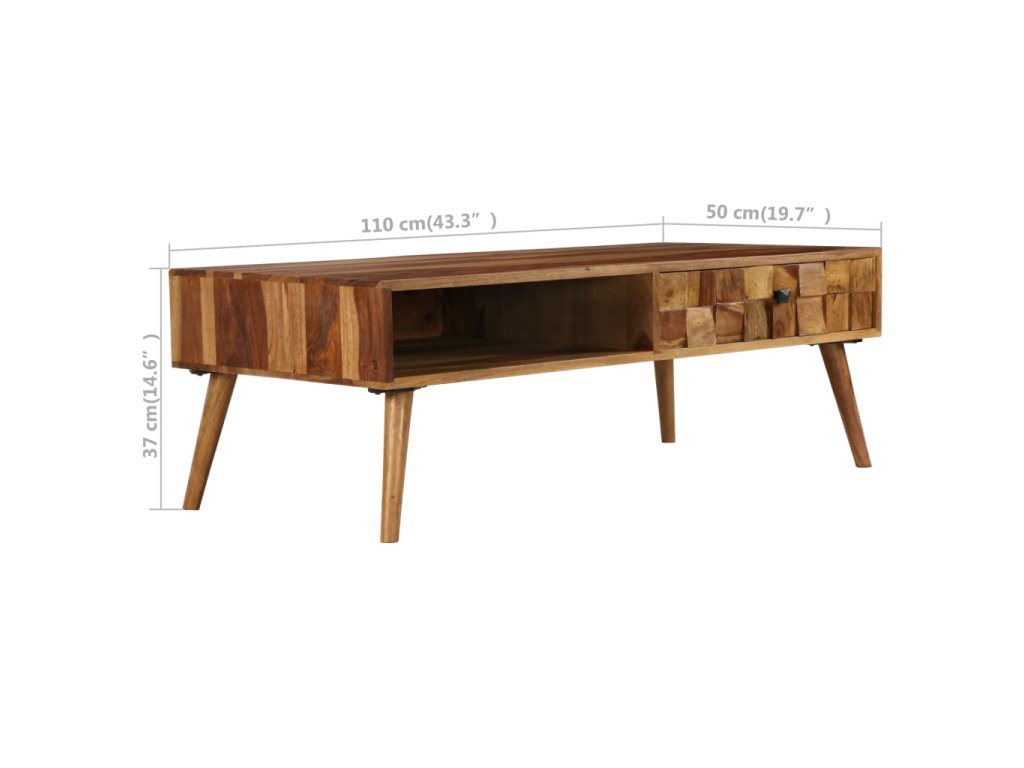 Tento stolek je vyroben z masivního akáciového dřeva a můžete jej rovněž použít jako odkládací či servírovací stolek. Akácie je tropické tvrdé dřevo, známé také jako rosewood nebo palisandr, které je proslulé svou bohatou texturou. Každá fáze výrobního procesu je prováděna s největší pečlivostí, ať už se jedná o leštění anebo lakování. Řemeslné zpracování a překrásná kresba dřeva se zasluhují o to, že je každý kus nábytku zcela jedinečný a lehce odlišný od ostatních. Tento stolek disponuje 1 úložnou přihrádkou a 1 zásuvkou, jež vám poskytnou spoustu prostoru pro ukládání knih, časopisů nebo jiných drobných předmětů, které chcete mít na dosah. Dřevěné nohy mu dodávají stabilitu a zvýrazňují jeho design ve stylu poloviny minulého století. Montáž je snadná.