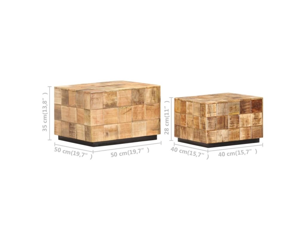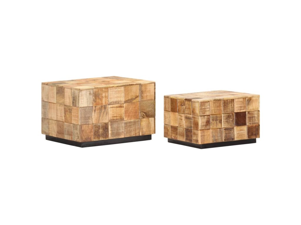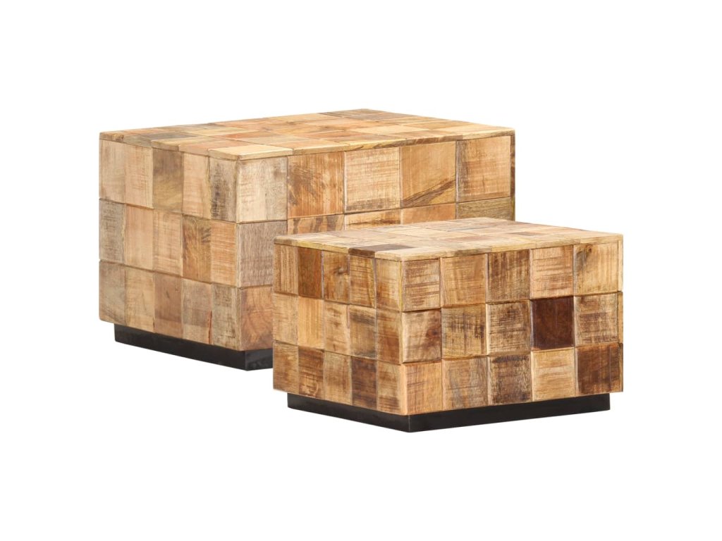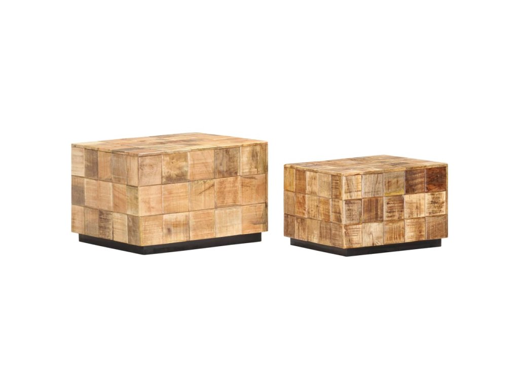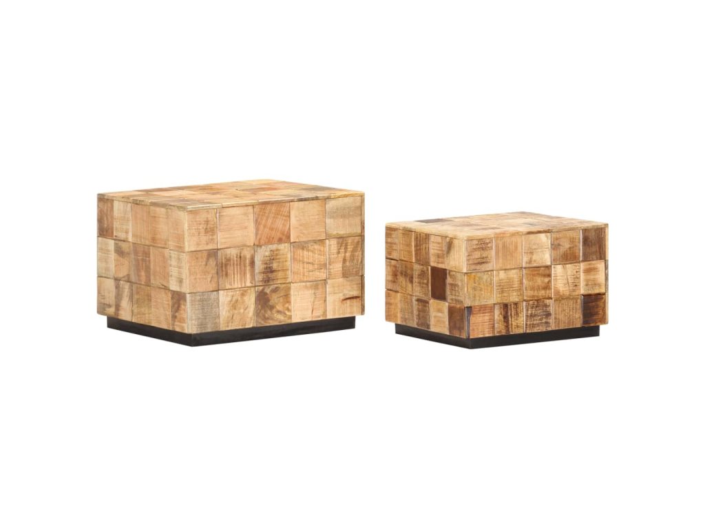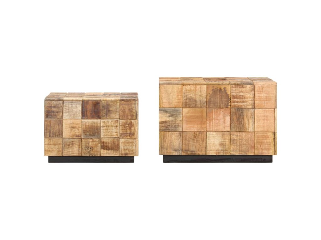 Tento set konferenčních stolků z masivních dřevěných špalíčků z mangovníkového dřeva je stylový a snadno se čistí vlhkým hadříkem. Mangovníkové dřevo je masivní, stabilní, má dlouhou životnost a okouzlující vzhled. Známky opotřebení a viditelná kresba dřeva vypovídají o unikátní historii každého kusu a zdůrazňují jeho přírodní krásu. Každý krok výrobního procesu se provádí s největší péčí, ať už jde o leštění, natírání nebo lakování. Stolky jsou perfektní pro odkládání nápojů, mís s ovocem, dekorací apod.