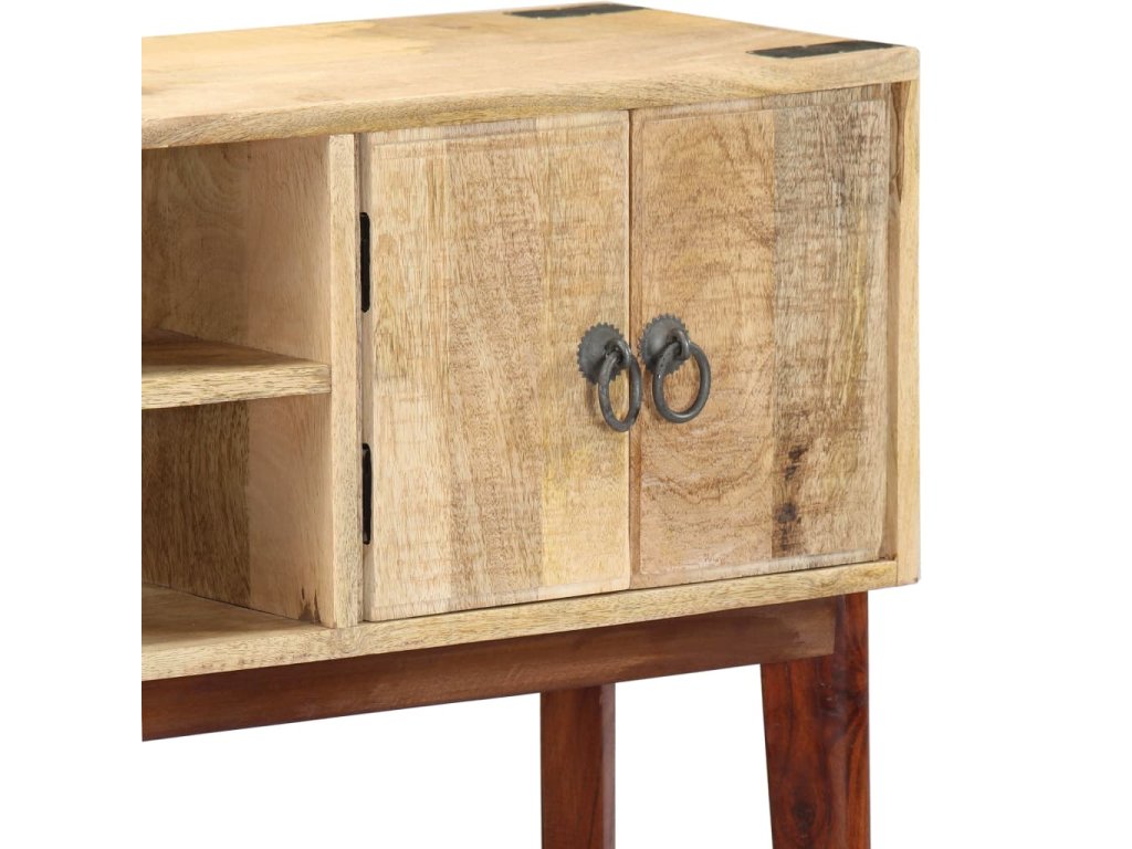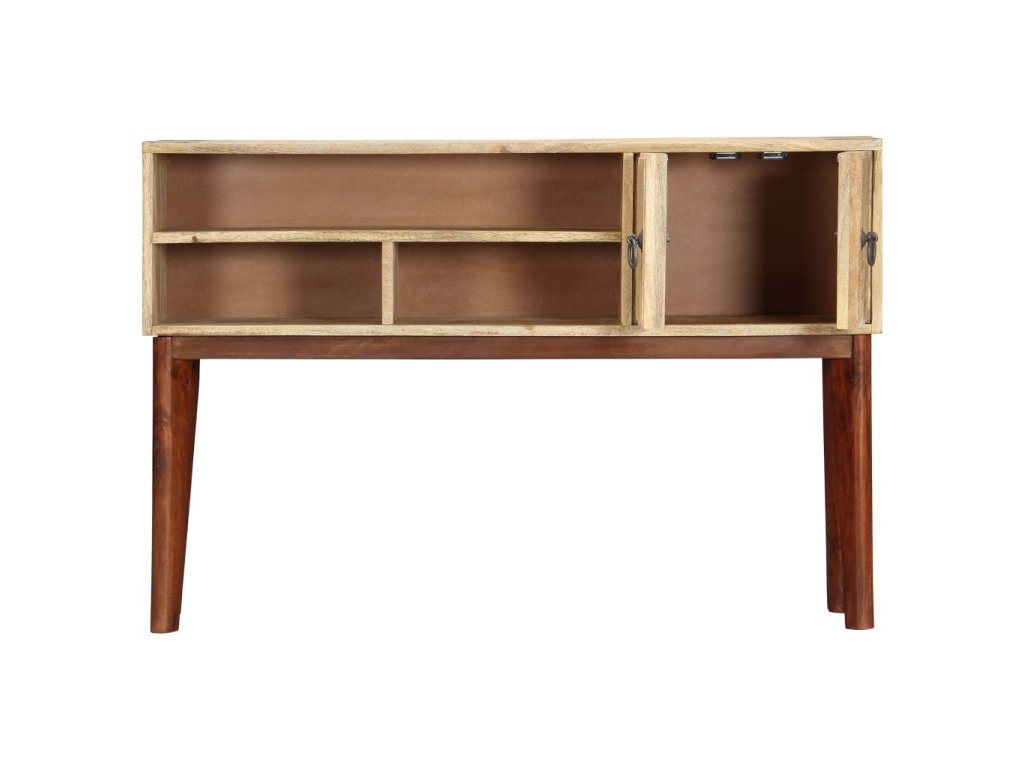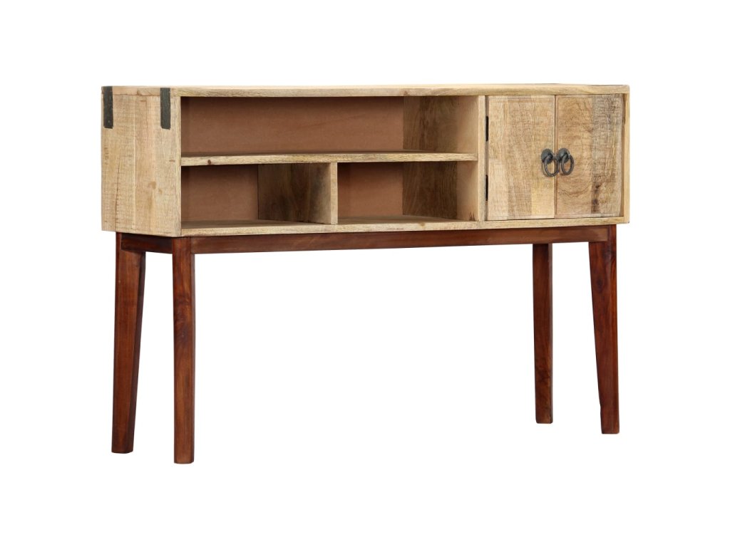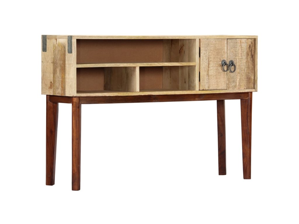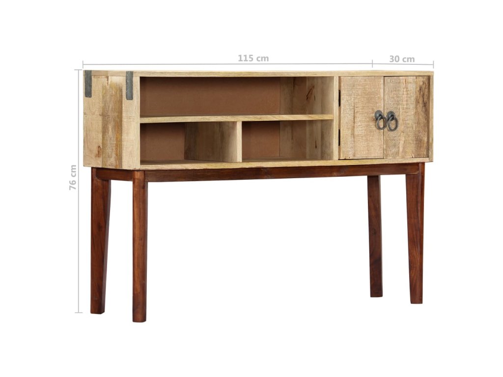 Stolek je zhotoven z masivního hrubého mangovníkového dřeva a má pevnou desku, na kterou si můžete vystavit dekorativní předměty, jako jsou mísy s ovocem či vázy. Pevné nohy zaručují jeho stabilitu a odolnost, takže vám vydrží sloužit po dlouhá léta. Mangovník je husté a robustní tvrdé dřevo s překrásnými zlatými či hnědými pruhy a konturami. Každá fáze výrobního procesu je prováděna s mimořádnou péčí, ať už se jedná o leštění, natírání anebo lakování. Stolek má skříňku s dvojitými dvířky a 3 otevřené přihrádky, v nichž najdete spoustu místa k přehlednému uspořádání nejrůznějších menších věcí tak, abyste je měli vždy po ruce.