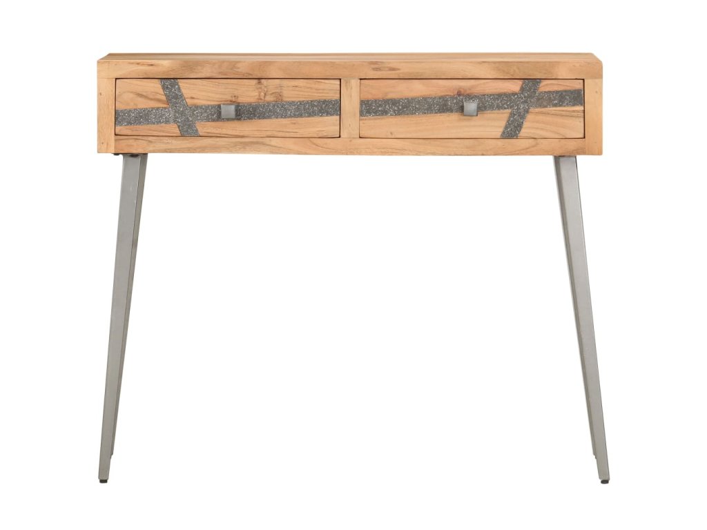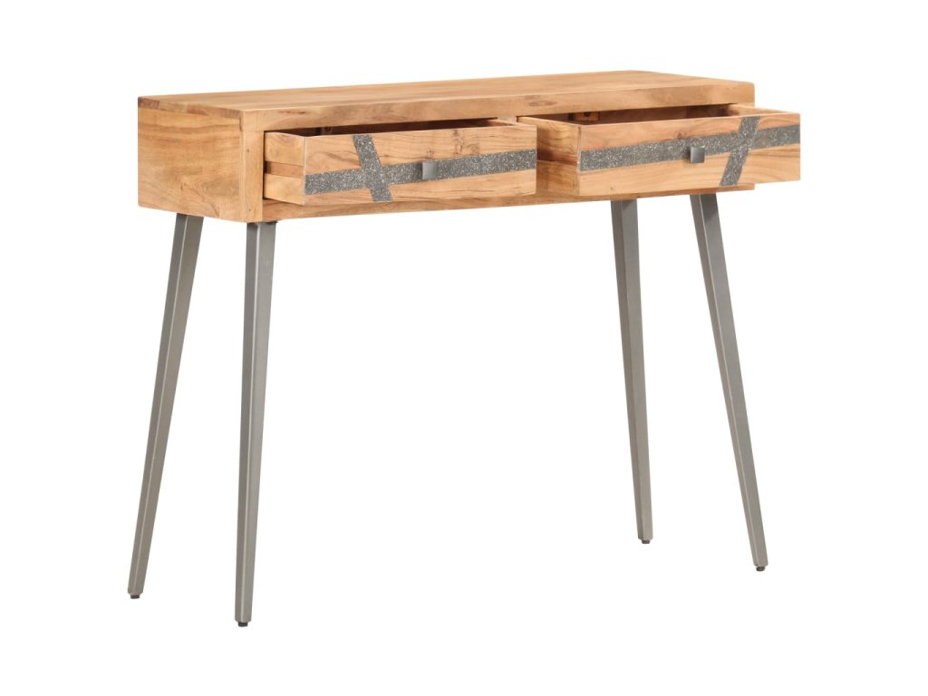 Odkládací stolek má na čelní straně dekorativní pruhy vykládané kamínky. Je zhotovený z akáciového dřeva, které je nejen pevné a odolné, ale zároveň také krásně vypadá. Zručné řemeslné zpracování a nádherná kresba dřeva dávají každému kusu nábytku jedinečný charakter, jímž se lehce liší od všech ostatních. Každý krok výrobního procesu je prováděný s tou největší péčí, ať už se jedná o leštění, natírání nebo lakování. Práškově lakované ocelové nohy zdůrazňují industriální styl nábytku. Stolek do předsíně navíc disponuje 2 zásuvkami, takže v něm najdete spoustu prostoru k přehlednému ukládání celé řady menších věcí, které chcete mít po ruce. Sestavení produktu je snadné.