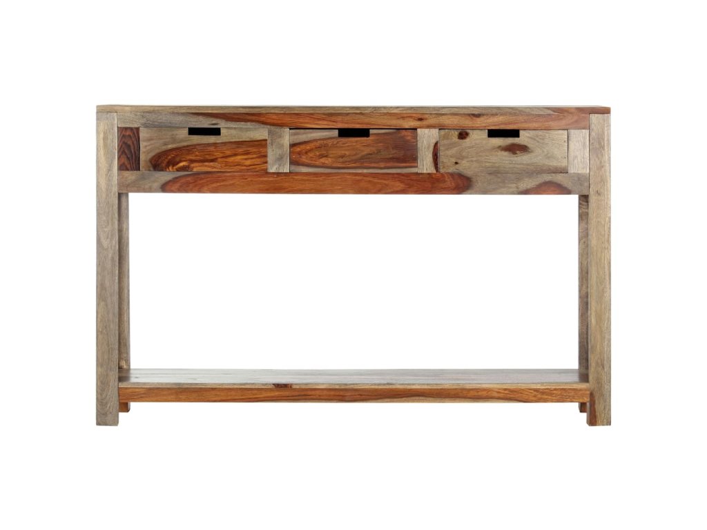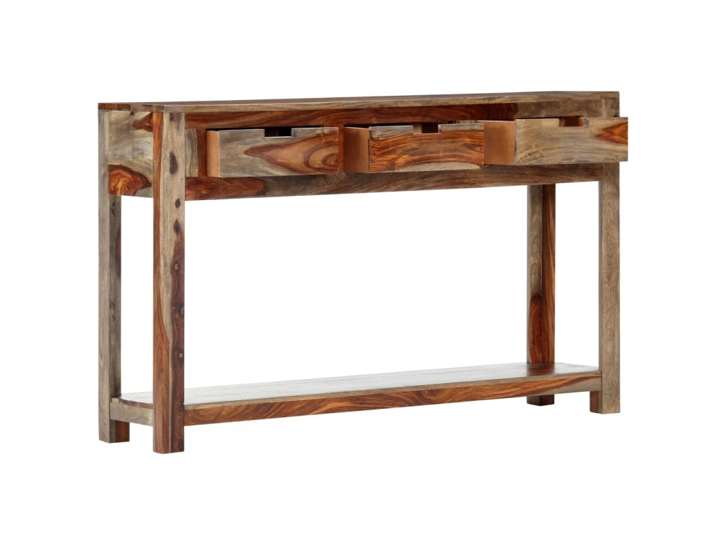 Tento konzolový stolek z masivního dřeva je stylový i praktický. Můžete jej také používat jako příborník, komodu, konzolovou skříňku. Elegantní design tohoto konzolového stolku bude výrazným prvkem v každé místnosti. Tento konzolový stolek má robustní stolní desku, na kterou můžete umístit dekorativní předměty, jako jsou koše s ovocem nebo vázy. 3 prostorné zásuvky a spodní police vám nabízejí dodatečný úložný prostor pro vaše drobné předměty jako jsou klíče, DVD, poznámkové zápisníky, pera a další nezbytnosti. Na spodní poličce najdete další místo k uspořádání vašich věcí.