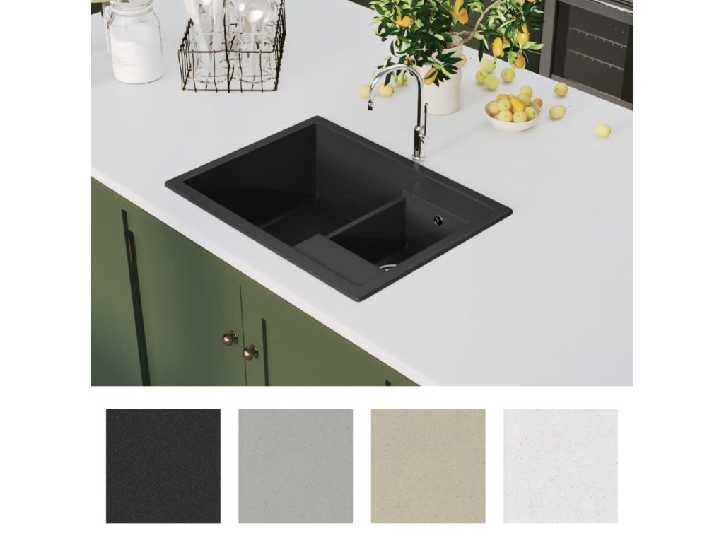 Náš žulový kuchyňský dřez je skvělým nadčasovým doplňkem do vaší kuchyně. Má elegantní design a tvoří ho jeden extra hluboký dřez a jeden malý dřez.