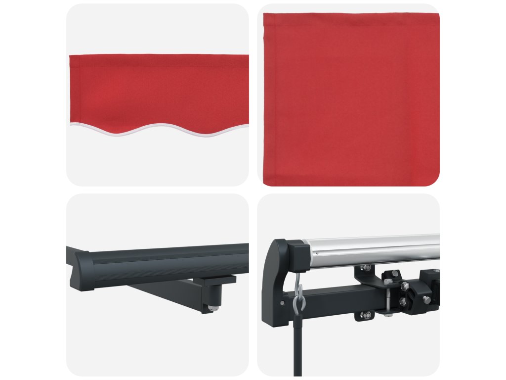 - Robustní materiály: Vyrobená z kvalitního polyesteru a odolné oceli, markýza skvěle odolává počasí a chrání před UV zářením, vodou i blednutím, což zajišťuje dlouhou životnost. Uživatelé mohou očekávat spolehlivé a vizuálně atraktivní řešení pro venkovní užívání po celou sezónu.