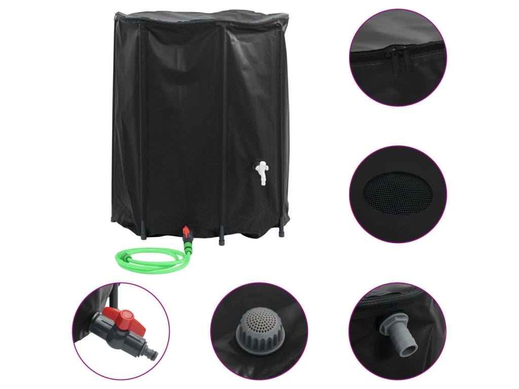 - Praktický design: Síťovaný kryt v horní části nádoby na dešťovou vodu zabraňuje přístupu listí a hmyzu k čisté vodě. Dvoucestný zip poskytuje nejen praktičnost, ale zároveň zajišťuje uzamčený prostor, aby se do něj nedostaly děti.