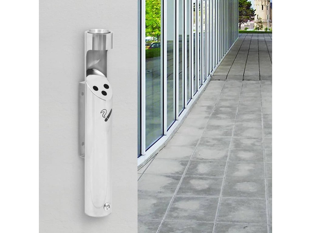 Tento popelník je vyrobený z nerezové oceli, připevňuje se na zeď a hodí se do interiéru i exteriéru. Má tvar válce s malým průměrem, takže je prostorově úsporný, a přesto má velkou kapacitu. Výklopné dno se otevírá směrem dolů pro snadné vyprazdňování popelníku.