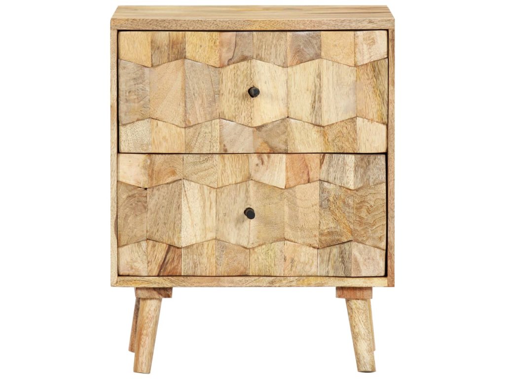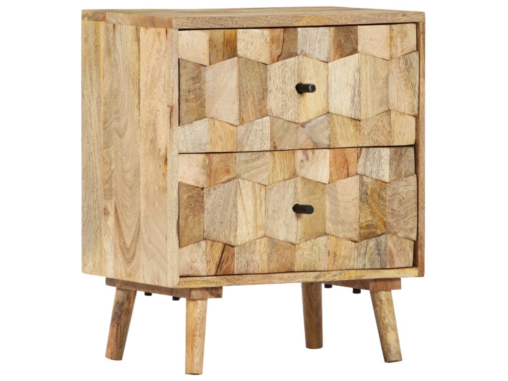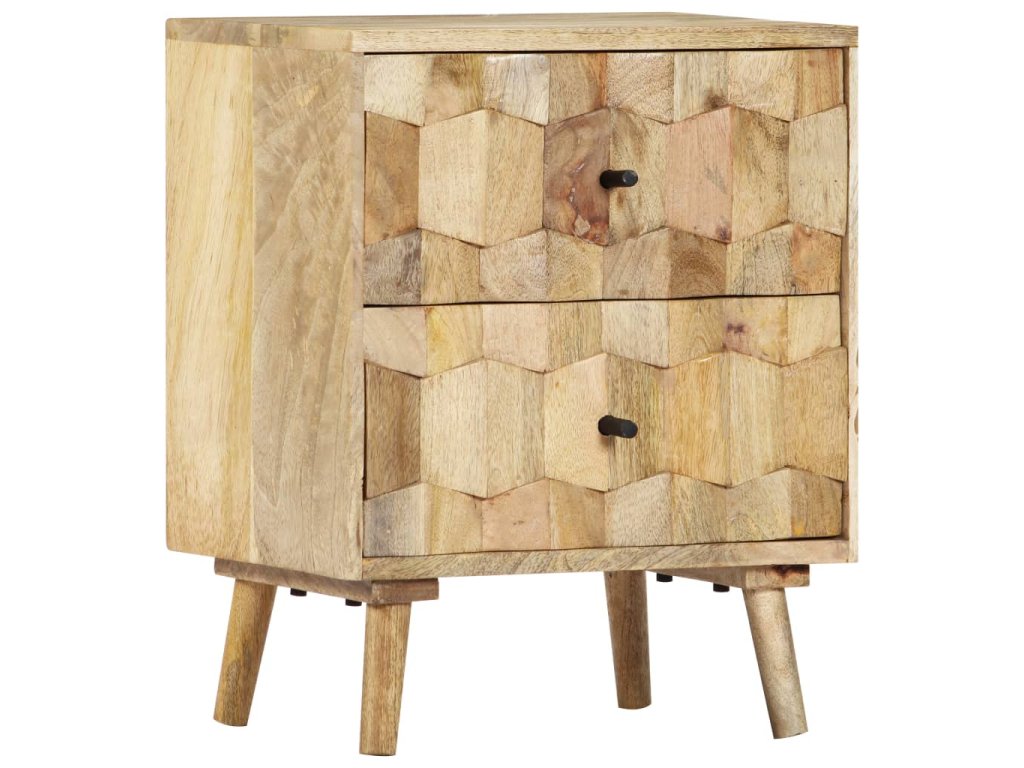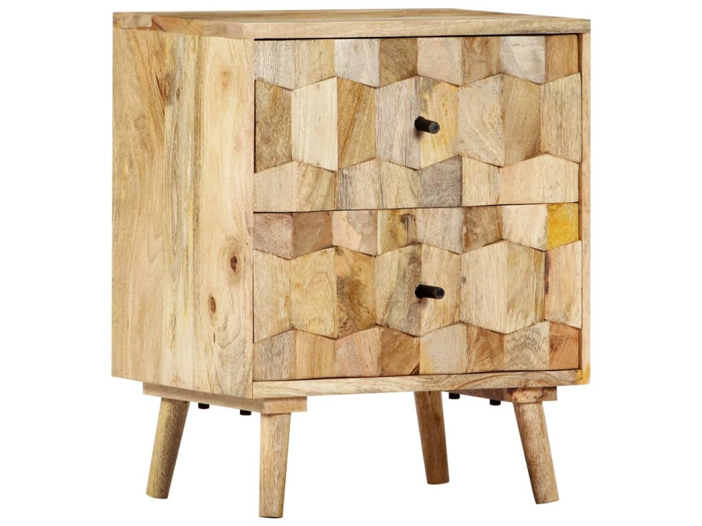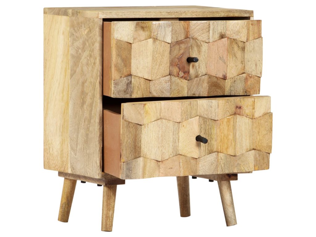 Noční stolek je vyrobený z masivního mangovníkového dřeva a byl naleštěn a nalakován, čemuž vděčí za svůj půvabný a rafinovaný vzhled. Mangovníkové dřevo je husté robustní tvrdé dřevo, které má na povrchu krásné hnědé a zlaté pruhy a kontury. Dvě zásuvky s vyřezávanými motivy dodávají nočnímu stolku na kráse a zároveň poskytují dostatek úložného prostoru pro přehledné uschování vašich drobností, které tak budete mít neustále po ruce. Sestavení skříňky k posteli je jednoduché a k jejímu čištění vám postačí vlhký hadřík.