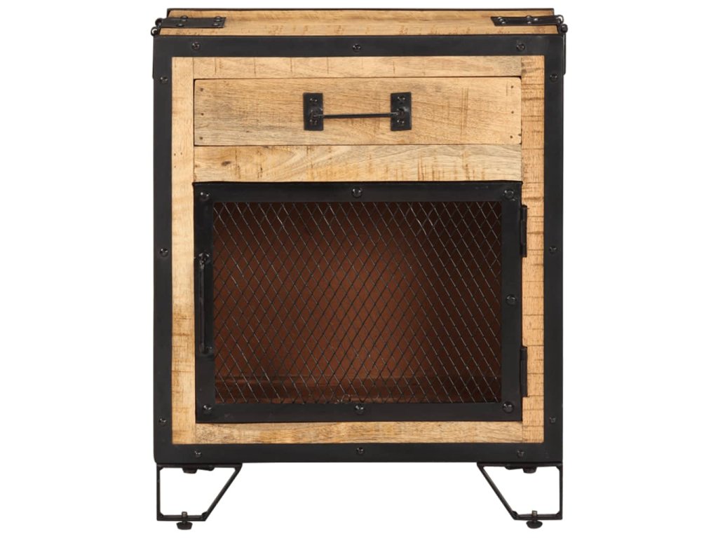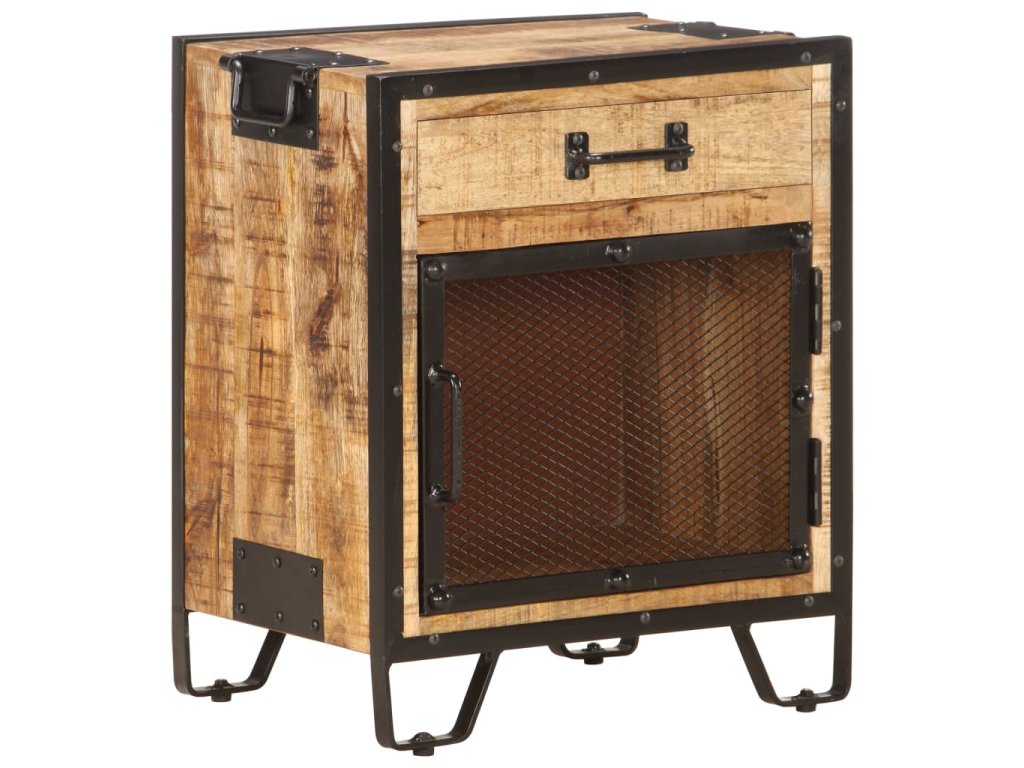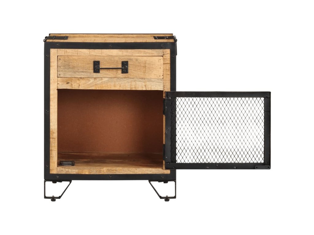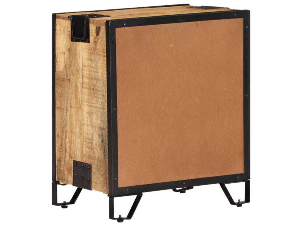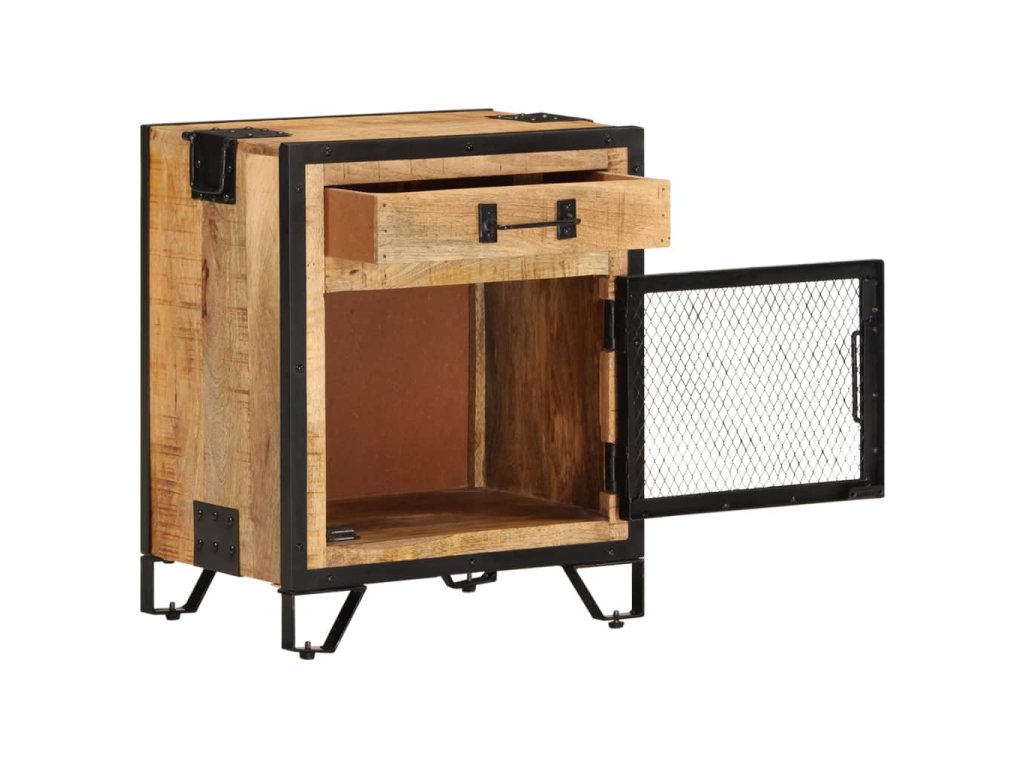 Noční skříňka je ručně vyrobená z oceli a masivního hrubého mangovníkového dřeva, takže je robustní a stabilní. Řemeslné zpracování a krásná kresba dřeva dává každému kusu nábytku jeho jedinečný a od všech ostatních mírně odlišný charakter. Noční stolek má také dostatek úložného prostoru, kde můžete udržovat důležité položky uspořádané a na dosah ruky. Sestavení noční skříňky je snadné.
