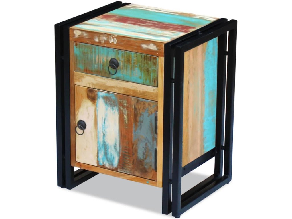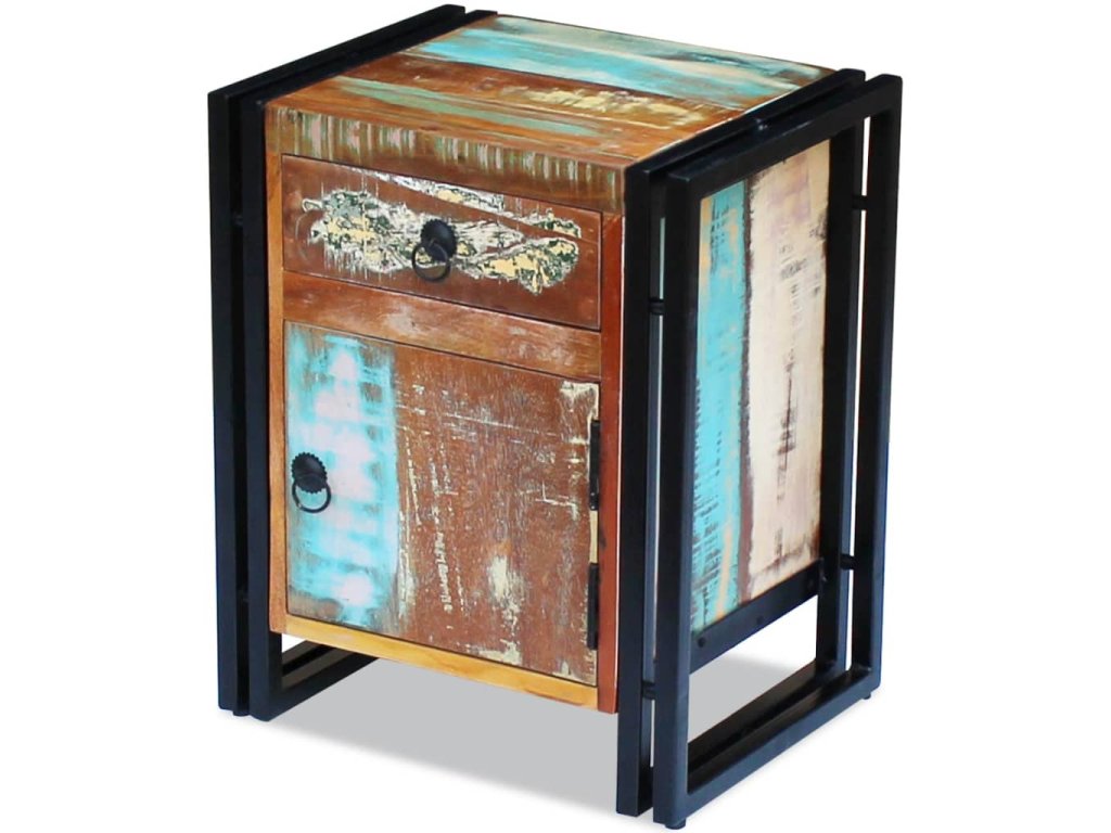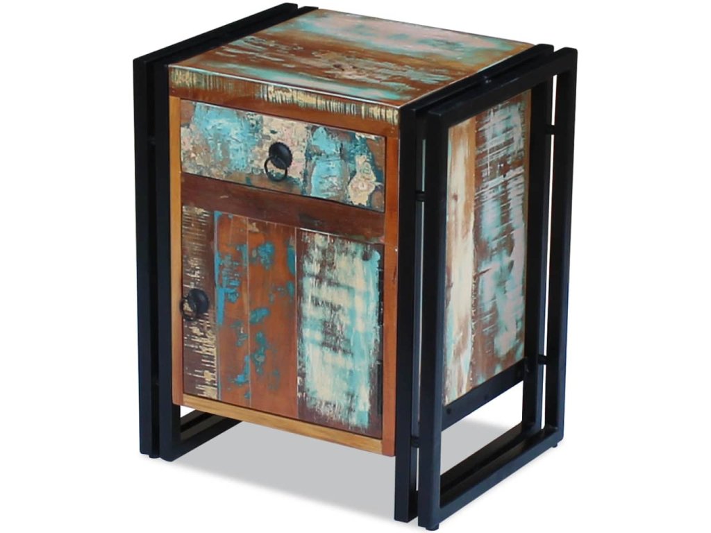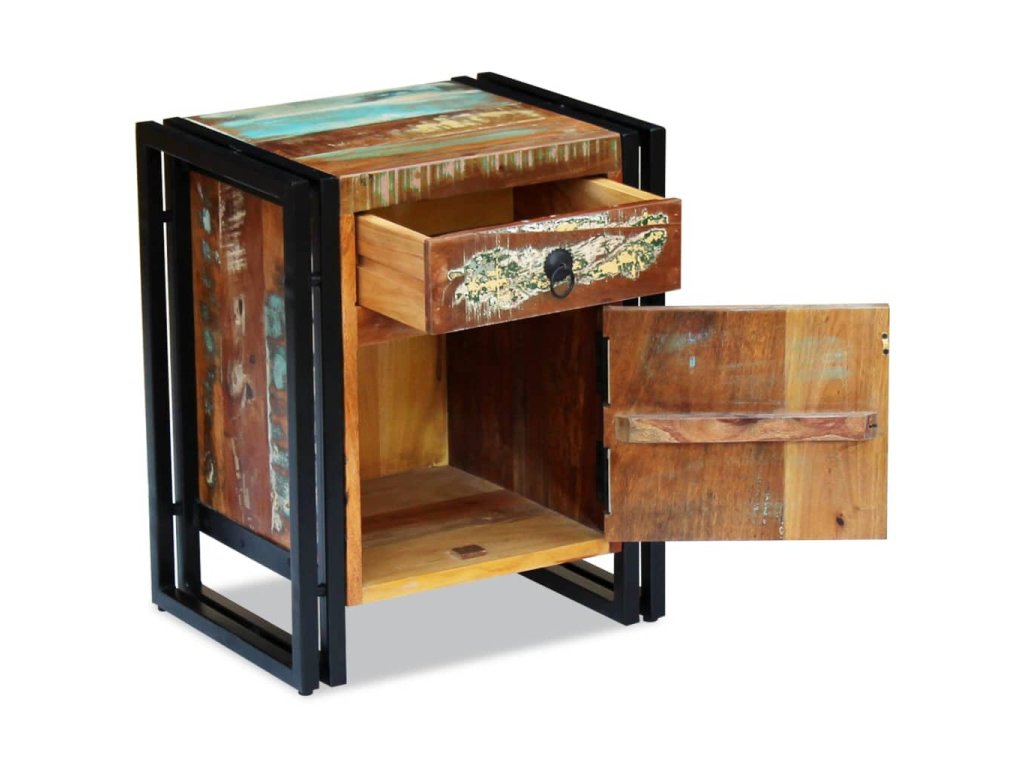 Tento noční stolek ve vintage stylu, vyrobený z masivního recyklovaného dřeva, bude nadčasovým doplňkem vašeho domova. Pevný ocelový rám dodává dřevěné skříňce na stabilitě a odolnosti. Je vybaven zásuvkou, do které lze uložit menší předměty a mít je vždy po ruce, a přihrádkou s dvířky, která poskytuje další úložný prostor. Noční stolek lze použít také jako odkládací skříňku nebo stolek na telefon.
