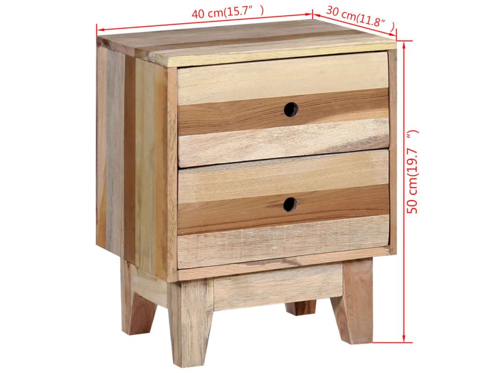 Noční stolek je vyrobený z recyklovaného dřeva, což znamená, že každý kus je jedinečný a lehce se odlišuje od ostatních. Nábytek vyrobený z použitého dřeva má vlastnosti různých druhů dřeva, jako je teak, akácie, mangovník, damarovník atd. Recyklované dřevo je masivní, solidní, odolné a krásné. Známky opotřebení a odhalená struktura dřeva dodávají každému kusu jeho vlastní historii a jedinečný vzhled.