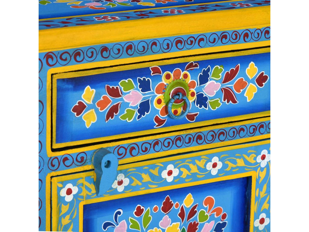 Noční stolek je ručně vyroben z masivního mangovníkového dřeva, které nejen, že krásně vypadá, ale také toho hodně vydrží. Řemeslné vyvedení jen podtrhuje jeho nevšední retro vzhled. Každá fáze jeho výroby byla provedena s největší pečlivostí, ať už se jedná o leštění, natírání nebo lakování. Stolek se navíc chlubí bohatým ručním malováním, jež mu propůjčuje honosný a útulný vzhled.