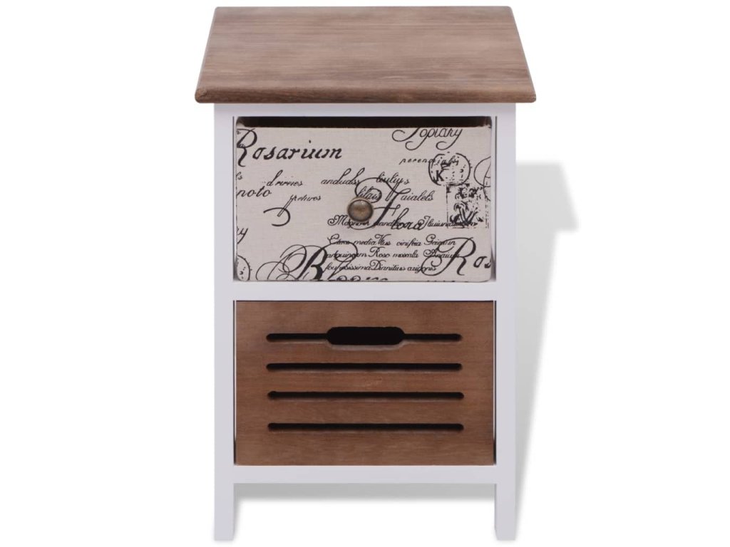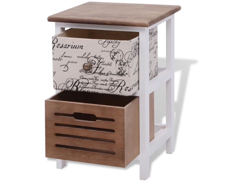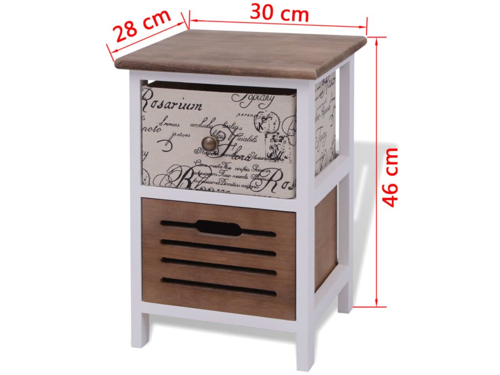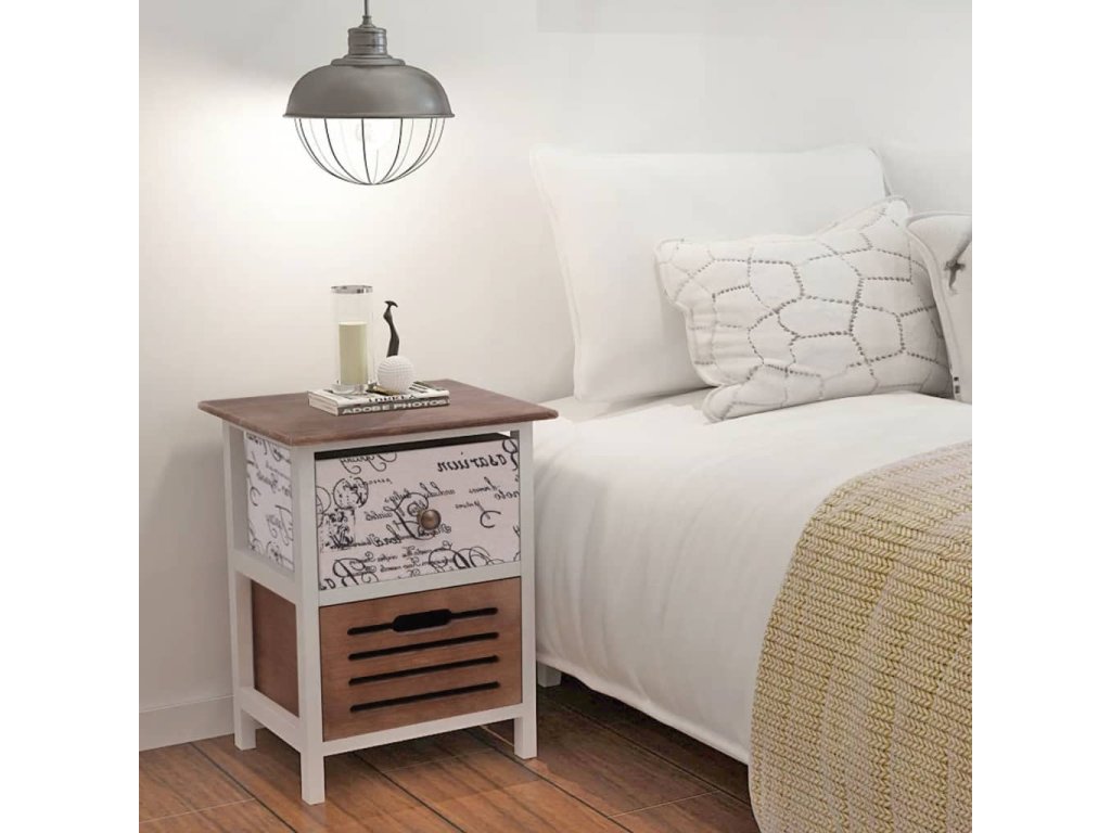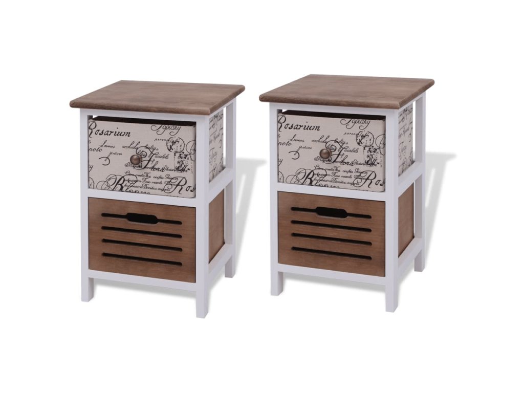 Tyto kompaktní noční stolky byly odborně zpracovány. Každý stolek má 2 zásuvky, které poskytují dostatek prostoru na vaše drobnosti, abyste je měli uklizené a na dosah. Potisk ve vintage venkovském stylu dodává stolkům rustikální půvab.