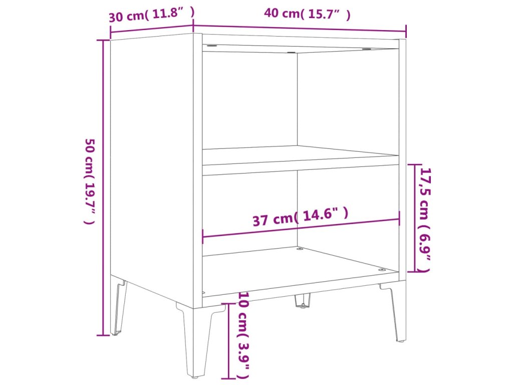 Noční stolek s kovovými nohami je stabilní a robustní. Navíc je noční stolek vybaven dvěma policemi, takže nabízí spoustu úložného prostoru pro přehledné uschování vašich nezbytností, které tak budete mít neustále po ruce. Snadno se čistí vlhkým hadříkem.
