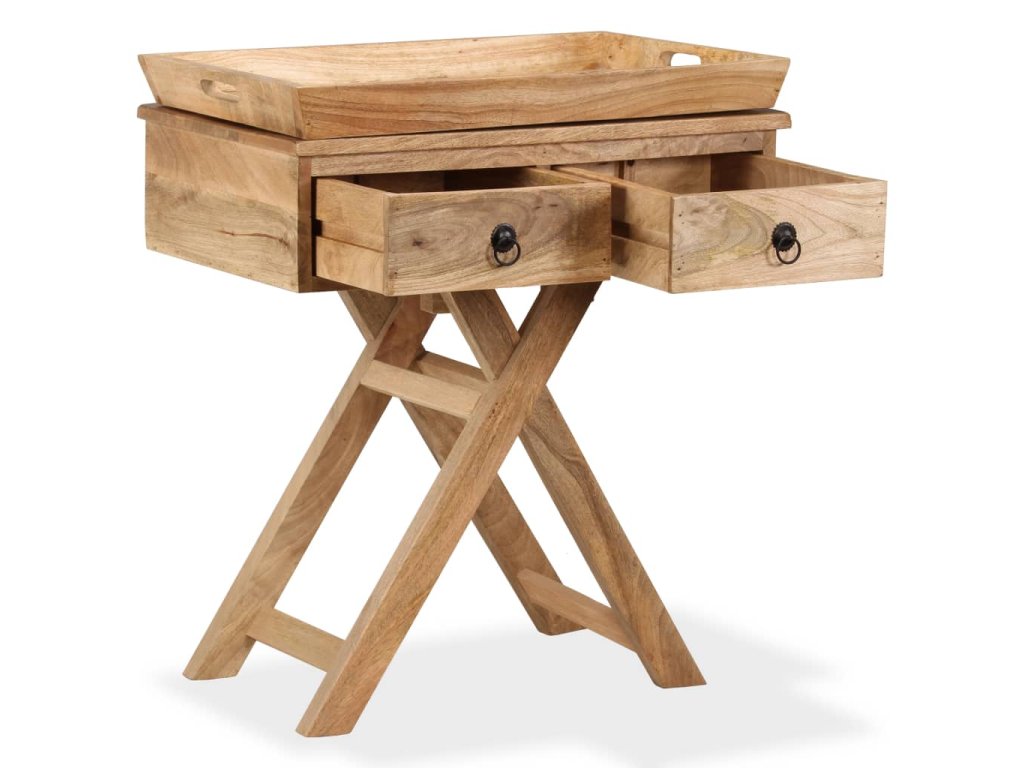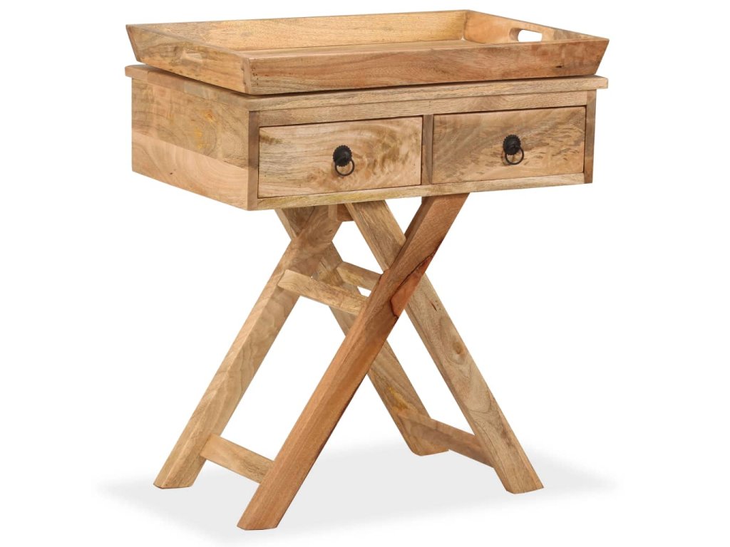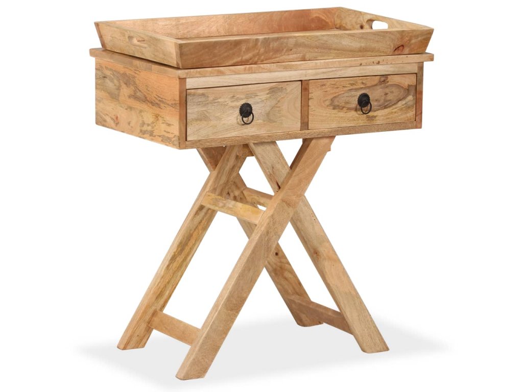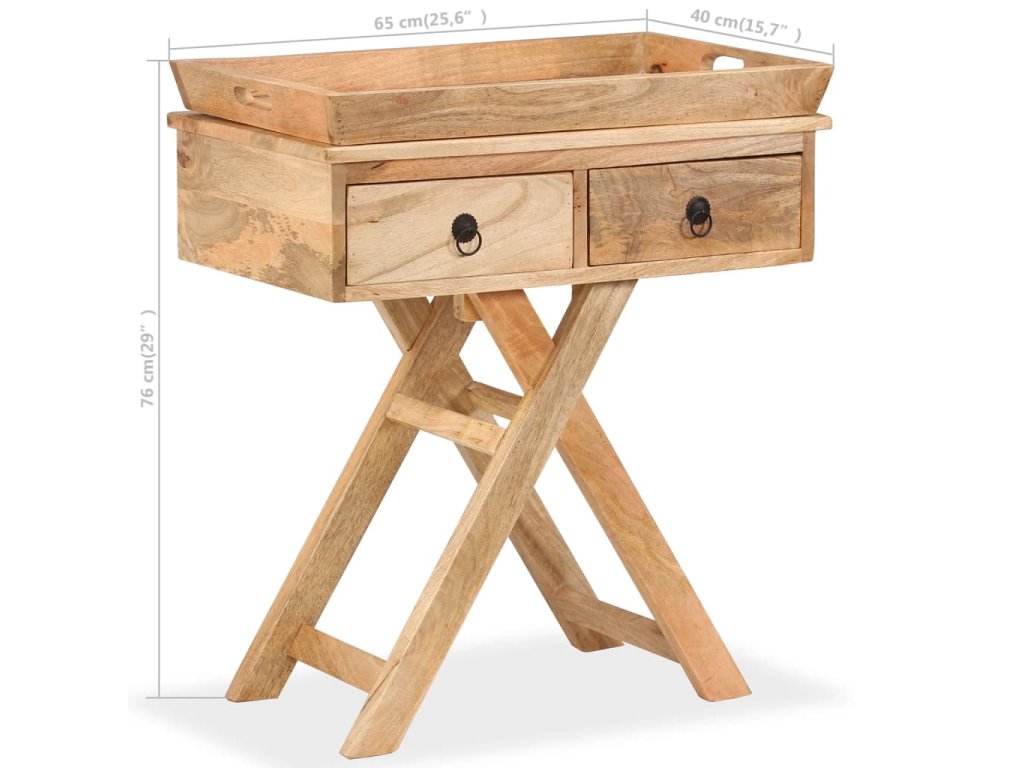 Odkládací stolek je ručně zhotoven z mangovníkového dřeva, které je nejen pevné, stabilní a odolné, ale zároveň také krásně vypadá. Zručné řemeslné zpracování přispívá k jeho okázalému retro stylu. Každá fáze výrobního procesu je prováděna s největší pečlivostí, ať už se jedná o leštění, natírání anebo lakování. Řemeslné zpracování a překrásná kresba dřeva činí každý kus nábytku unikátní a lehce odlišný od ostatních. Stolní deska je současně velký servírovací podnos, který lze snadno sejmout a v případě potřeby používat samostatně. Poskytuje také spoustu prostoru k pokládání nápojů nebo k vystavování dekorativních předmětů, jako jsou košíky s ovocem nebo vázy. Design stolku disponuje dvěma zásuvkami, kde si můžete přehledně uspořádat své menší předměty tak, abyste je měli po ruce. Nohy ve tvaru X přispívají ke stabilitě stolku a zároveň umocňují jeho úchvatný retro vzhled. Montáž je snadná.