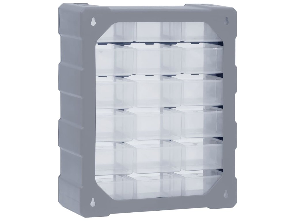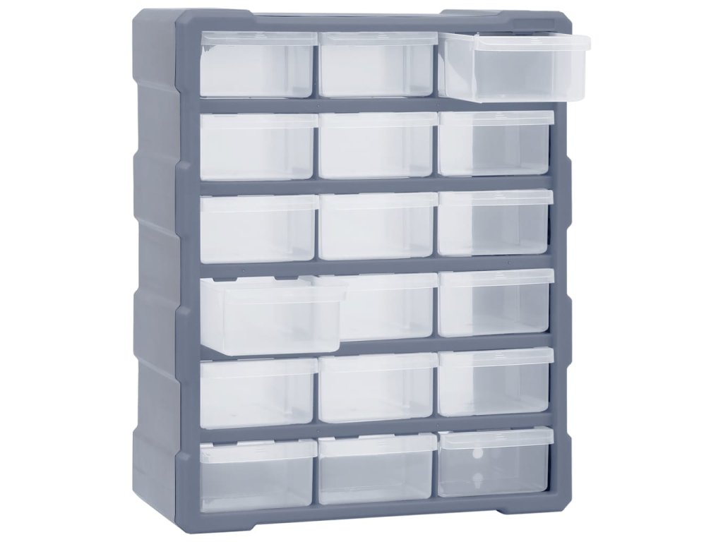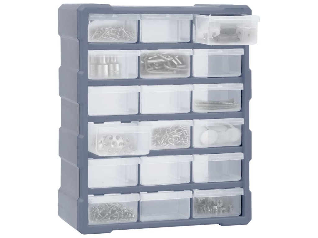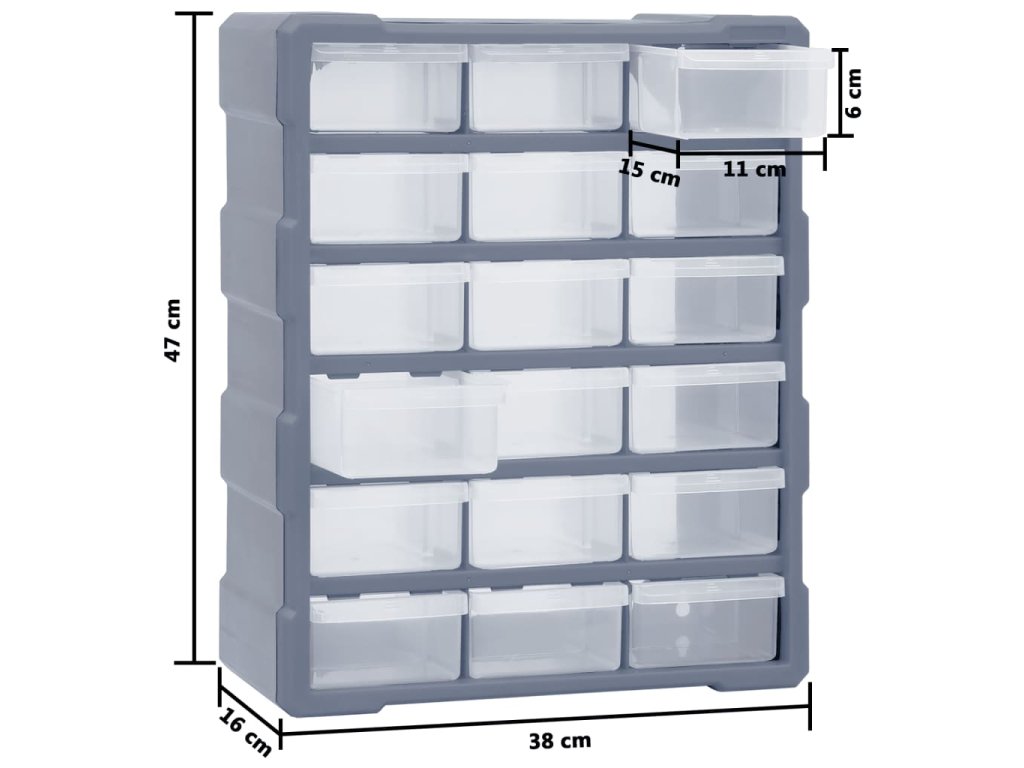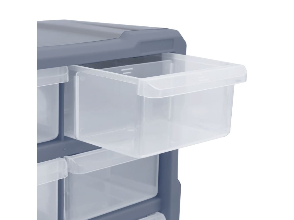 Úložný box obsahuje 18 středních zásuvek, aby vyhověl vašim nejrůznějším potřebám. Efektivně pomáhá s organizací nářadí a dalšího příslušenství, jako jsou spojovací materiály, takže je budete mít vždy po ruce. Skříňka je vyrobená z nárazuvzdorného plastu, je tedy jak odolná, tak stabilní. Zásuvky z průhledného plastu umožňují snadno a rychle rozpoznat obsah. Box se skvěle hodí k ukládání matic, šroubů, hřebíků a dalších spojovacích prvků a příslušenství obecně.