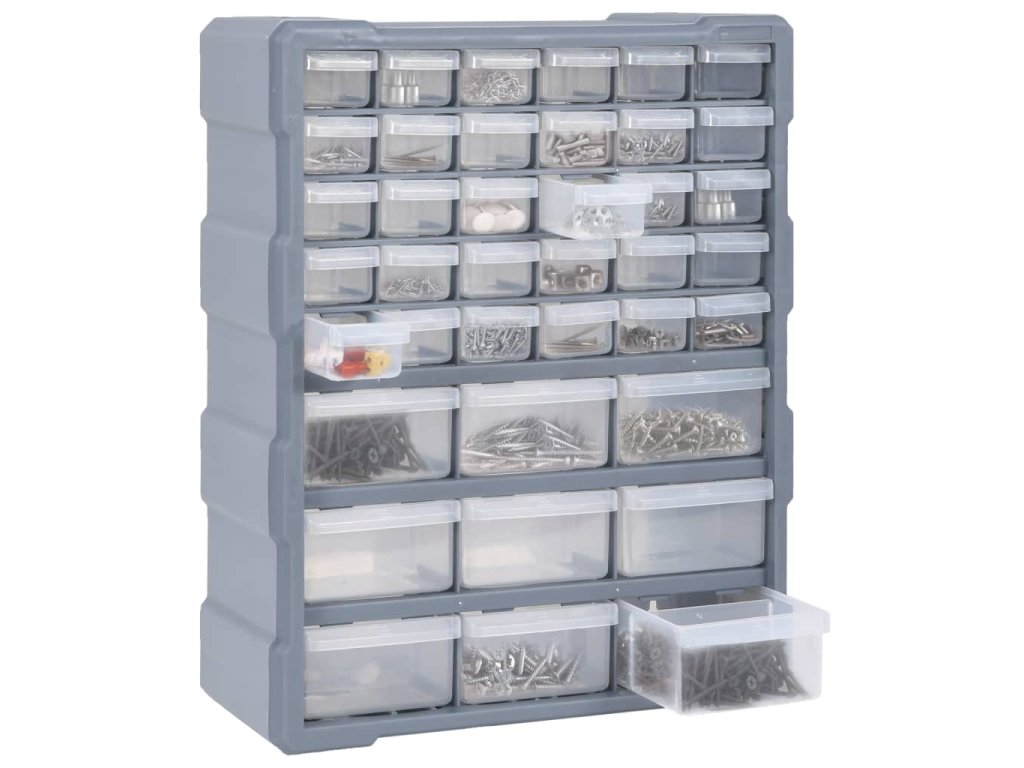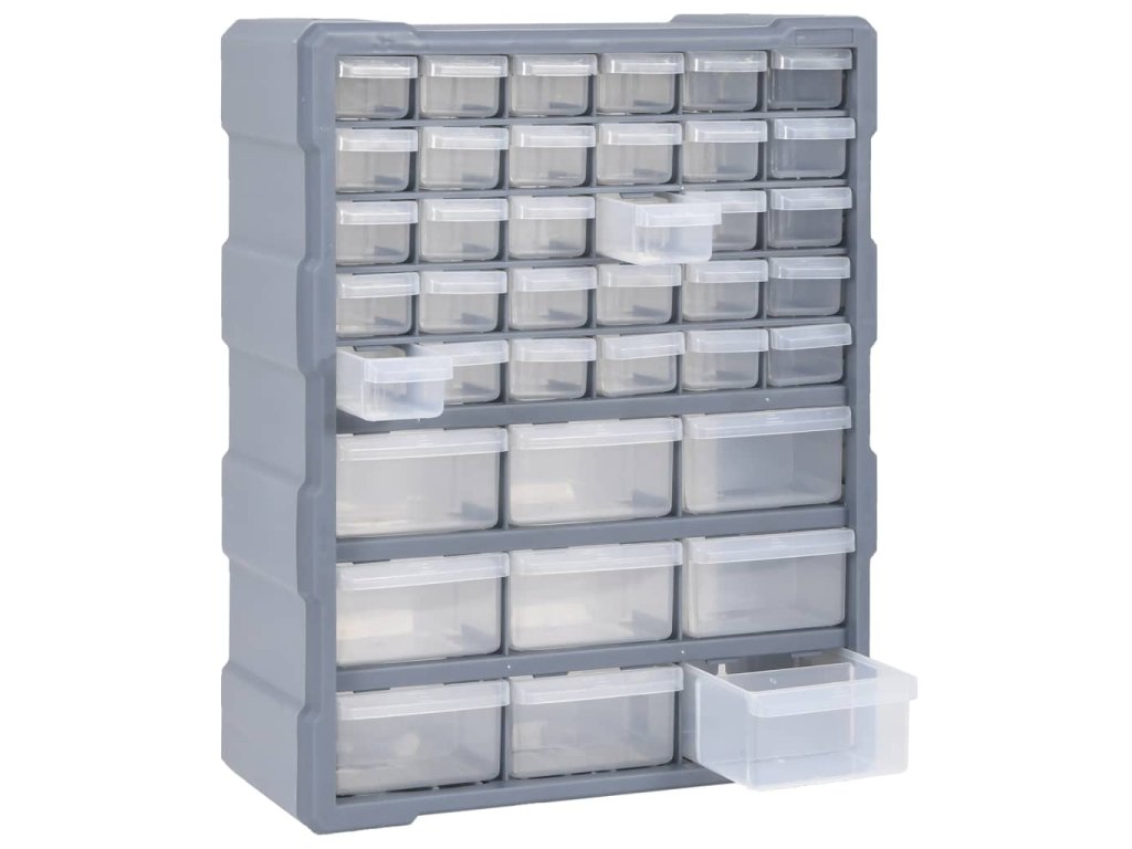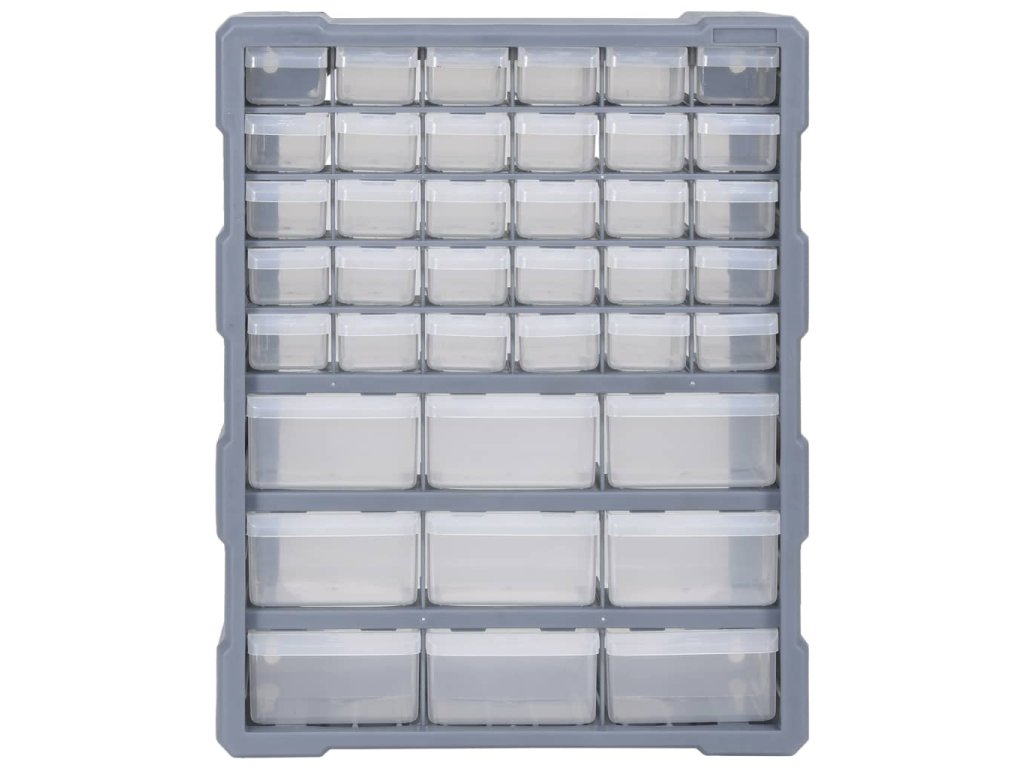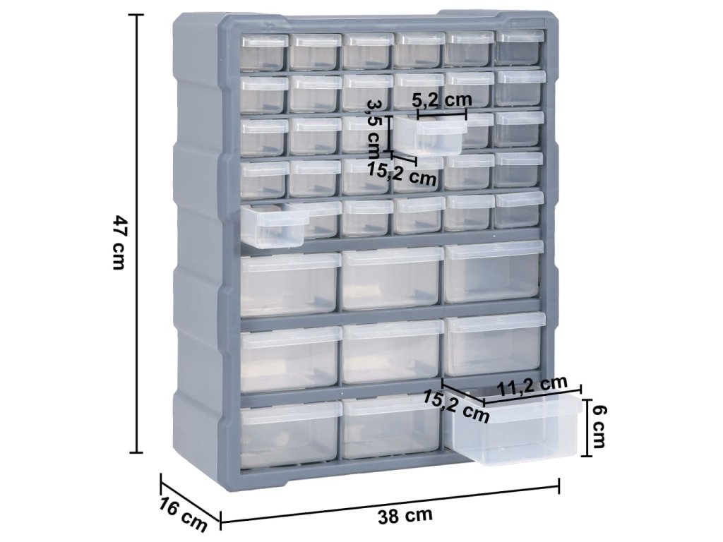 Úložný box obsahuje 30 malých zásuvek a 9 středních zásuvek, aby vyhověl vašim nejrůznějším potřebám. Pomůže vám přehledně si uspořádat své nářadí a další příslušenství, jako jsou upevňovací materiály, které budete mít nyní vždy po ruce. Skříňka je vyrobená z nárazuvzdorného plastu, je tedy jak odolná, tak stabilní. Zásuvky z průhledného plastu umožňují snadné a rychlé rozpoznání obsahu. Box se skvěle hodí k ukládání matic, šroubů, hřebíků a dalších upevňovacích dílů a příslušenství obecně.