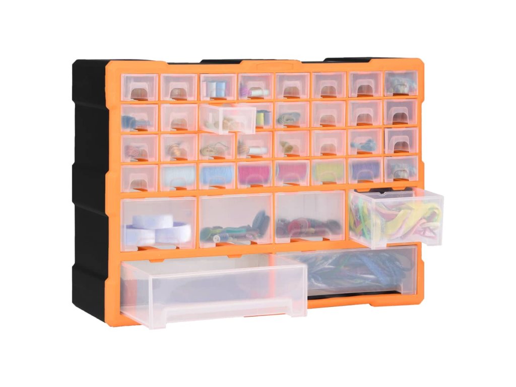 Úložný box obsahuje 32 malých zásuvek, 4 střední zásuvky a 2 velké zásuvky, aby vyhověl vašim nejrůznějším potřebám. Pomůže vám přehledně si uspořádat své nářadí a další příslušenství, jako jsou upevňovací materiály, které budete mít nyní vždy po ruce. Skříňka je vyrobená z nárazuvzdorného plastu, je tedy jak odolná, tak stabilní. Zásuvky z průhledného plastu umožňují snadné a rychlé rozpoznání obsahu. Box se skvěle hodí k ukládání matic, šroubů, hřebíků a dalších upevňovacích dílů a příslušenství obecně.