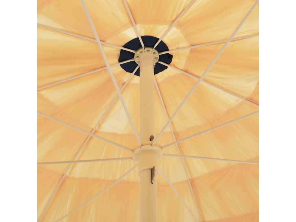 Stříška slunečníku je vyrobena z několika vrstev polypropylenových proužků, které jsou odolné vůči UV záření a povětrnostním vlivům a zároveň dobře vypadají. Navíc jsou podšity polyesterovou látkou, takže se slunečník hodí na venkovní použití. Tyč a žebra z oceli s práškovým nástřikem zajišťují, že se slunečník nehýbe a hodně toho vydrží. Stříšku samotnou pak můžete naklápět a přizpůsobovat ji pohybům slunce.