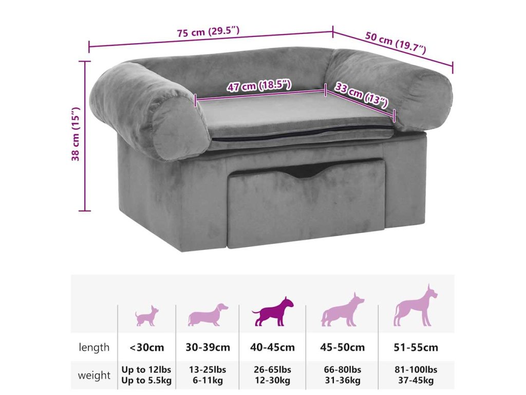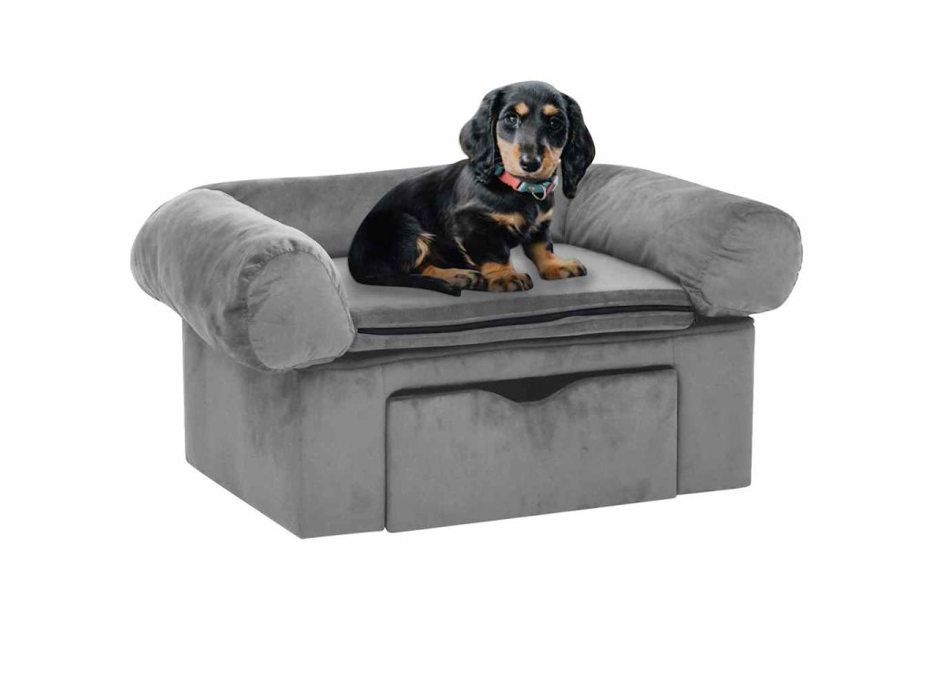 Hustě polstrovaná pohovka pro domácí mazlíčky má dřevěný rám potažený měkkým plyšem, aby se na ní vašim chlupatým kamarádům pohodlně odpočívalo. Ve spodní části najdete zásuvku, kam můžete šikovně uklidit nejrůznější potřeby pro vašeho psa, abyste je měli hezky po ruce. Vnější tělo je také mimořádně odolné, váš pejsek proto může relaxovat v naprostém bezpečí. Potah matrace lze vyprat, aby pohovka zůstala krásně svěží.