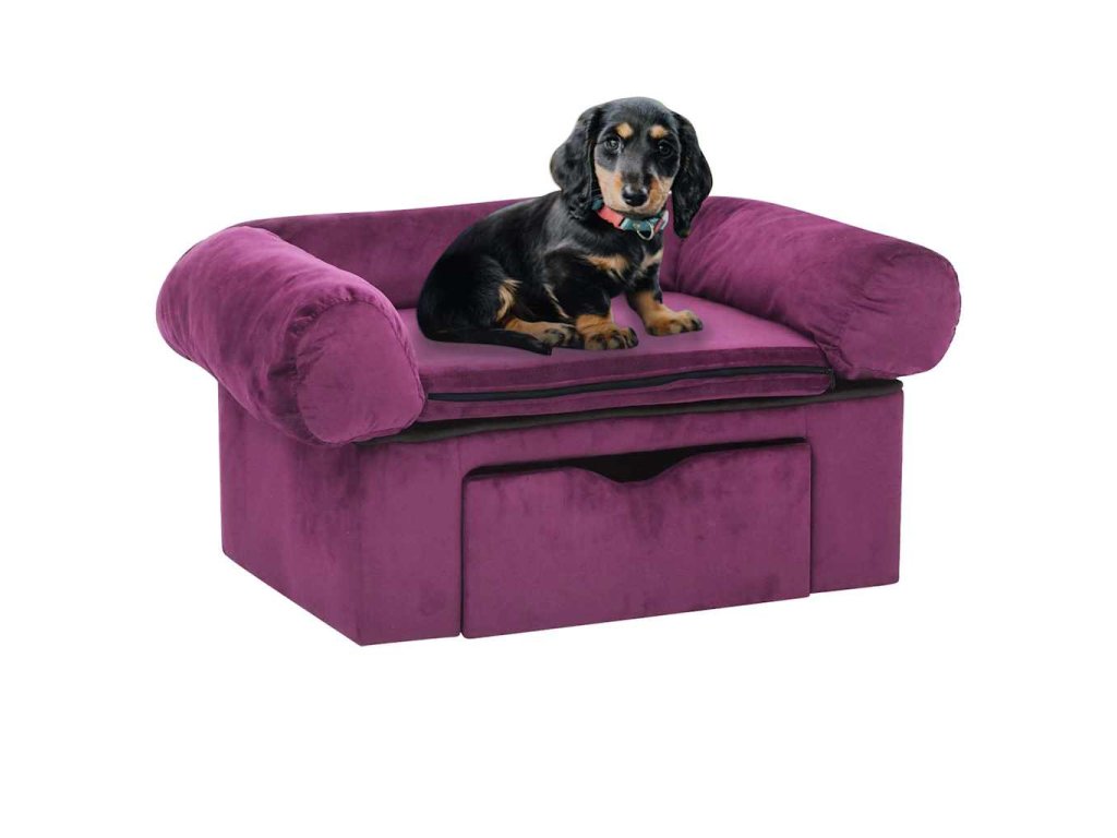 Hustě polstrovaná pohovka pro domácí mazlíčky má dřevěný rám potažený měkkým plyšem, aby se na ní vašim chlupatým kamarádům pohodlně odpočívalo. Ve spodní části najdete zásuvku, kam můžete šikovně uklidit nejrůznější potřeby pro vašeho psa, abyste je měli hezky po ruce. Vnější tělo je také mimořádně odolné, váš pejsek proto může relaxovat v naprostém bezpečí. Potah matrace lze vyprat, aby pohovka zůstala krásně svěží.