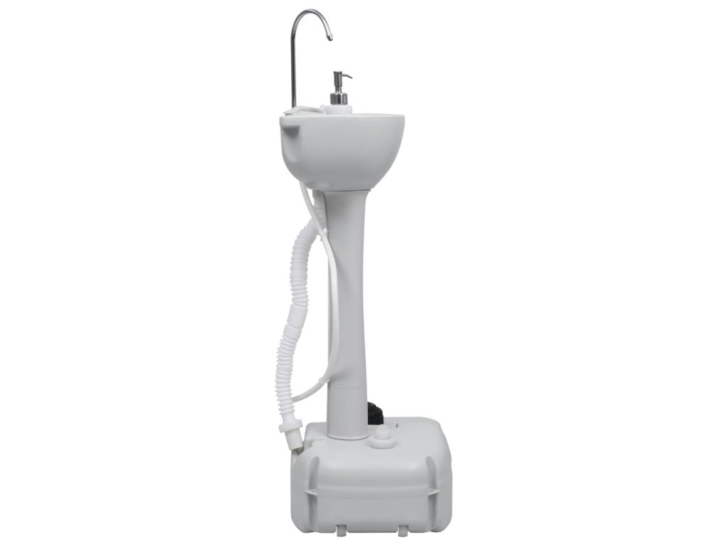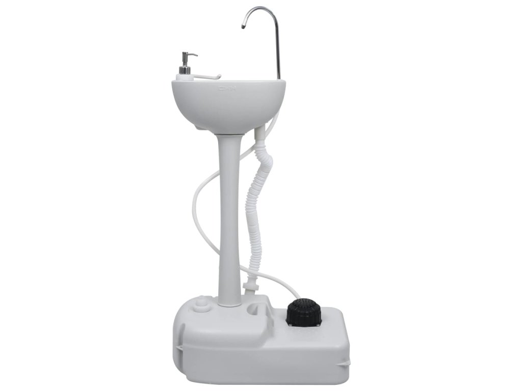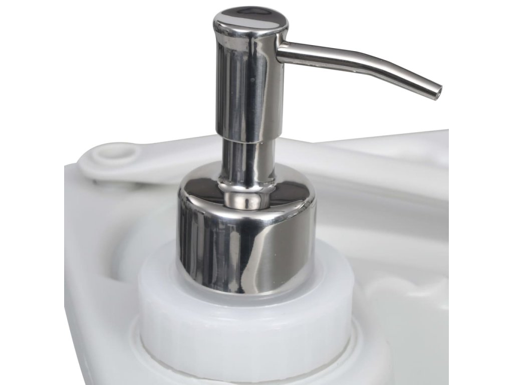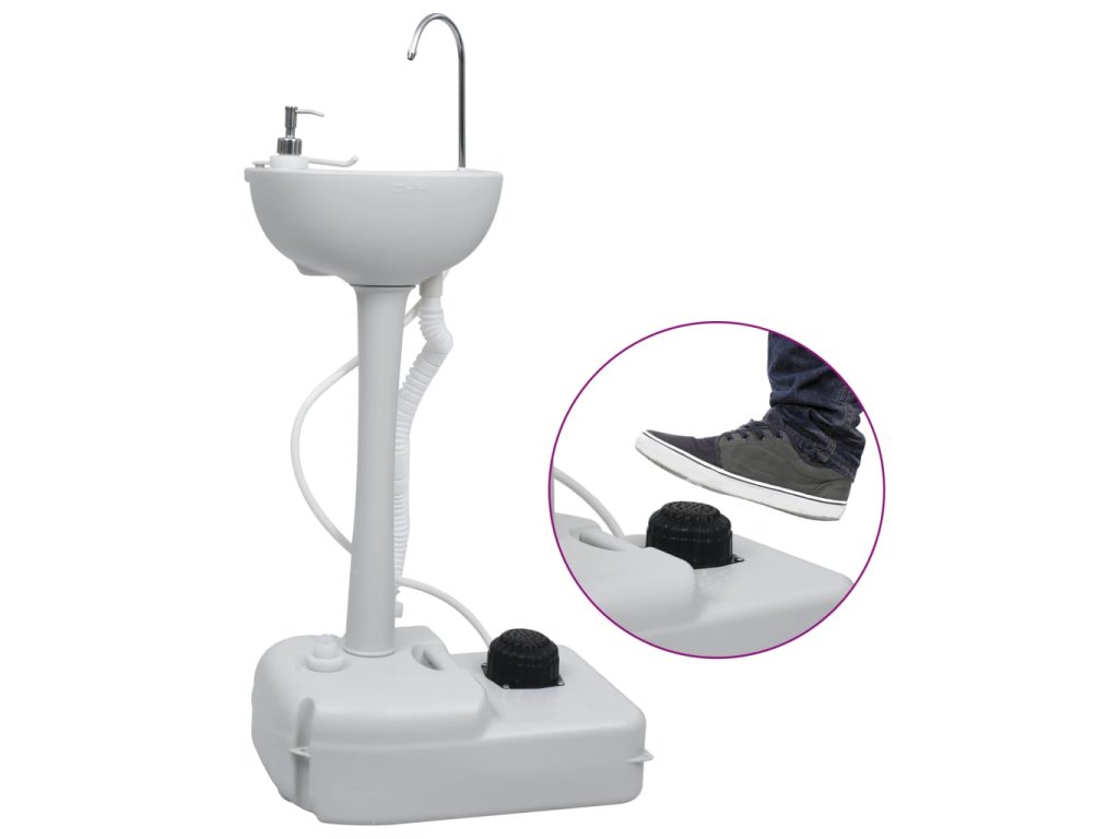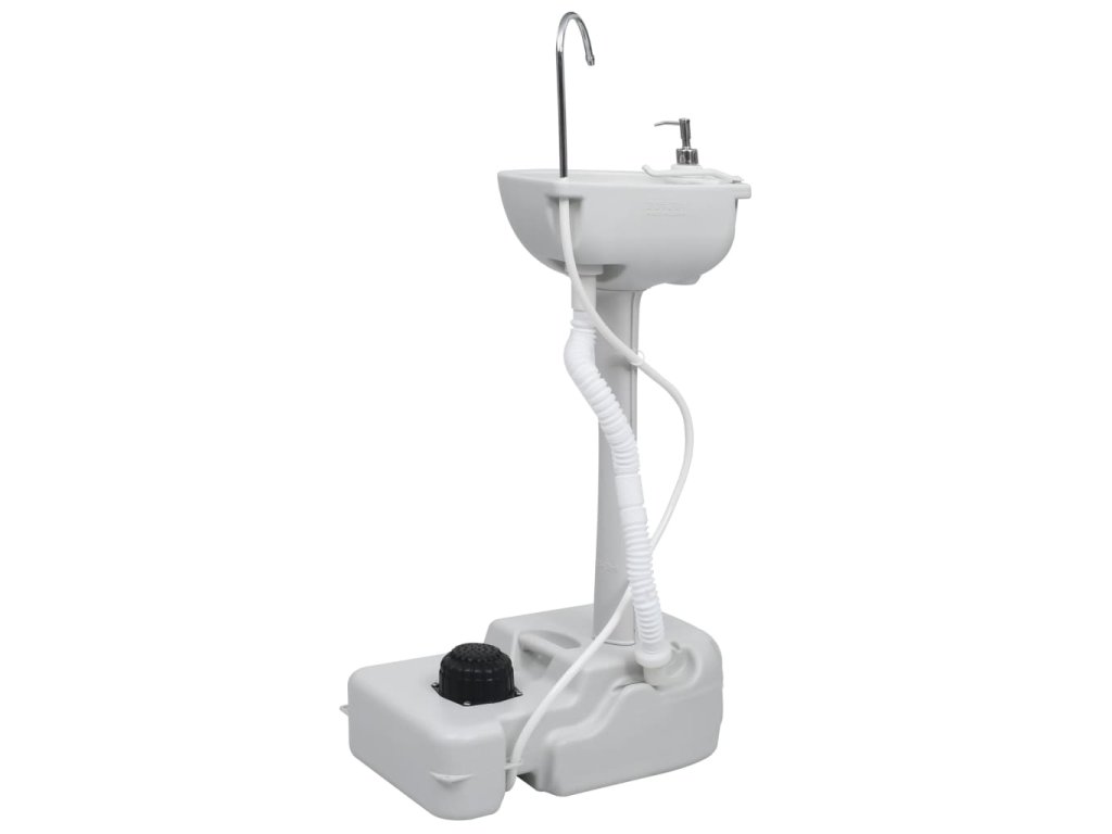 Kempingové umyvadlo se dodává se stanem, který vám poskytne soukromí v přírodě. Sklolaminátová tyč zajišťuje jeho stabilitu a krytá střecha je určená pro větší soukromí při mytí nebo oblékání v přírodě. Stojan na mytí rukou je vybaven 3litrovým dávkovačem mýdla, držákem na ručník a 17litrovou nádrží na sladkou vodu. Proud vody spustíte sešlápnutím nožního pedálu bez použití rukou. Umyvadlo je také vybavené dvěma zabudovanými kolečky pro snadnou přepravu.